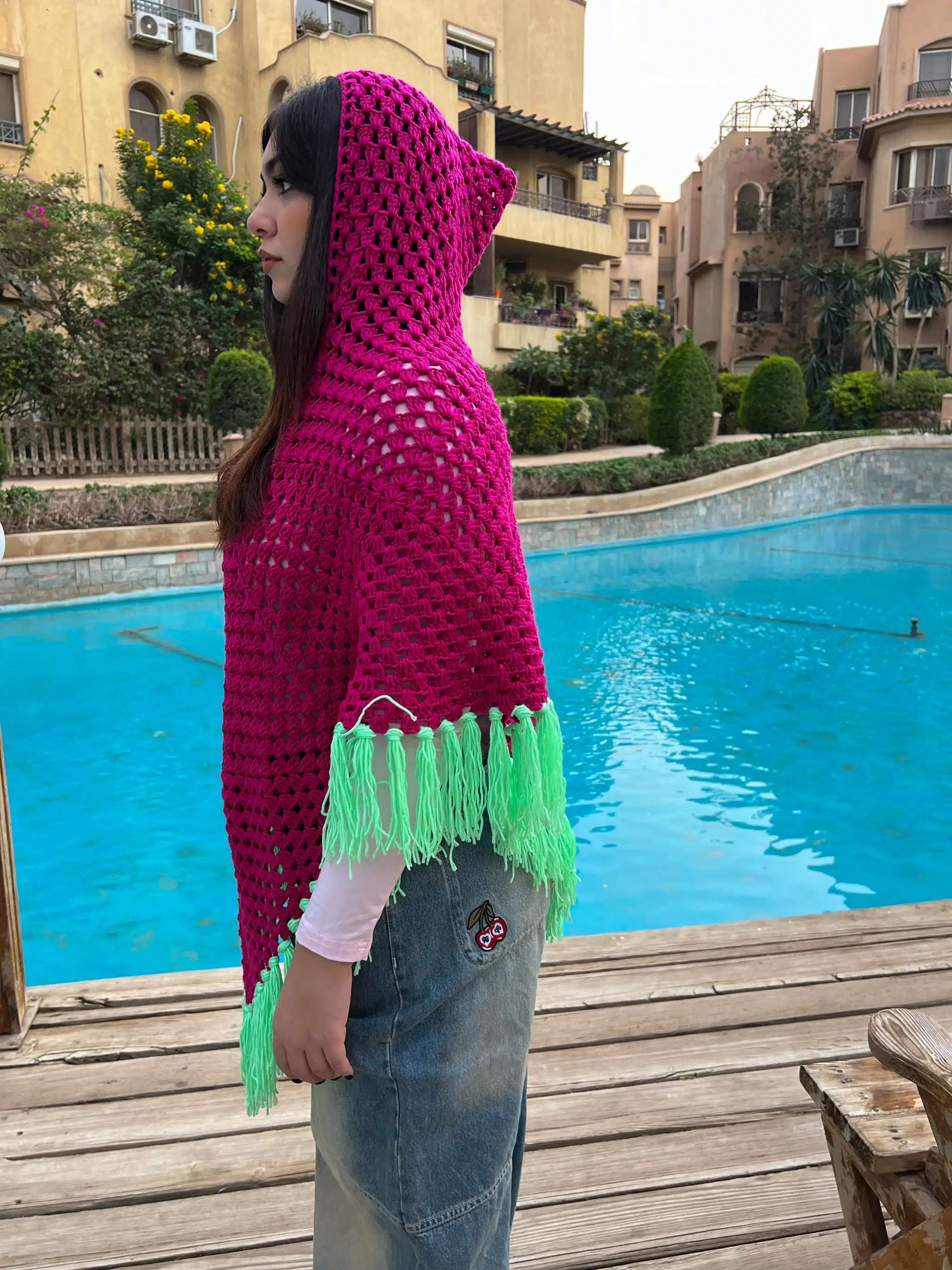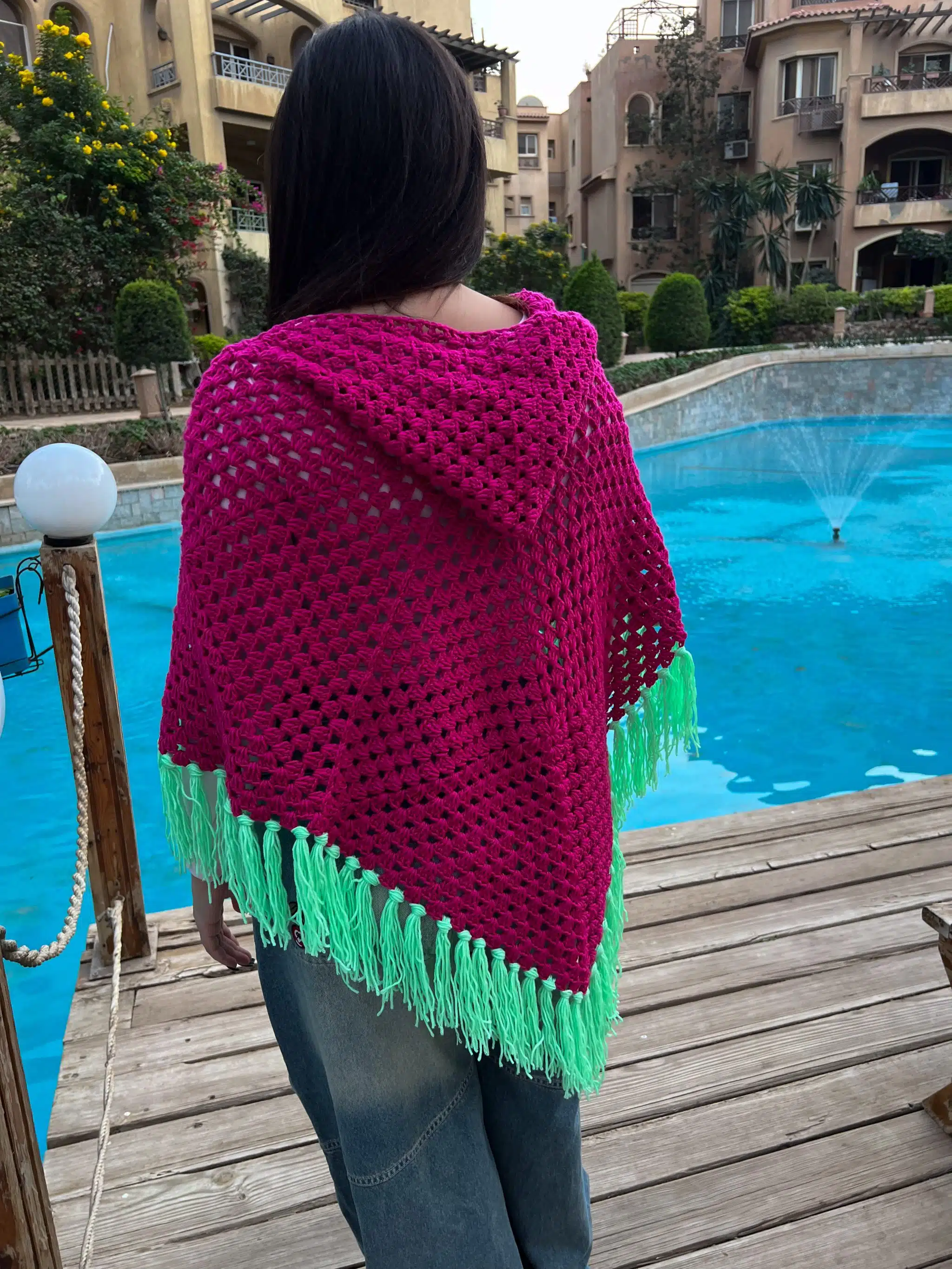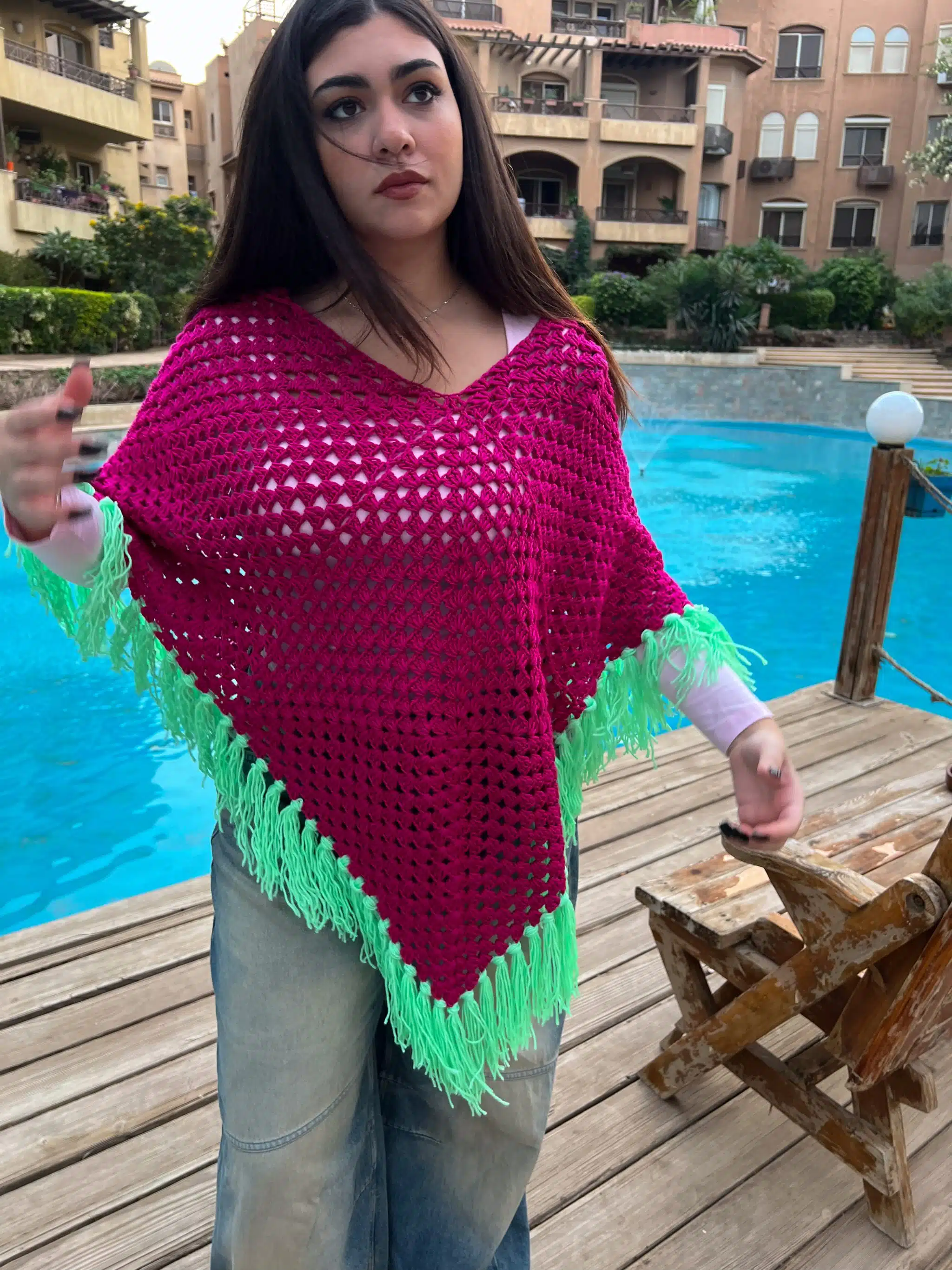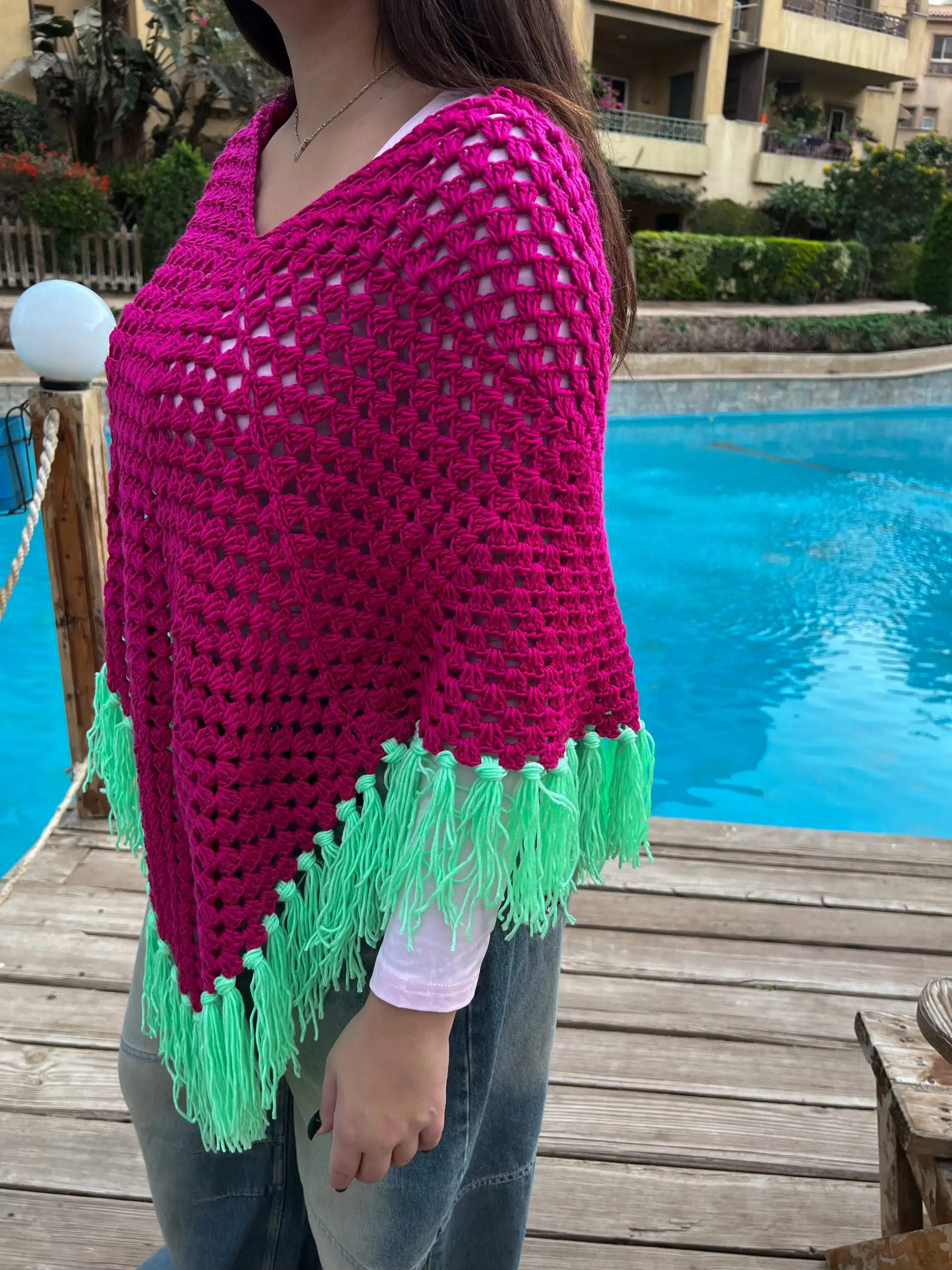 Fuschia & Green Crochet Puncho