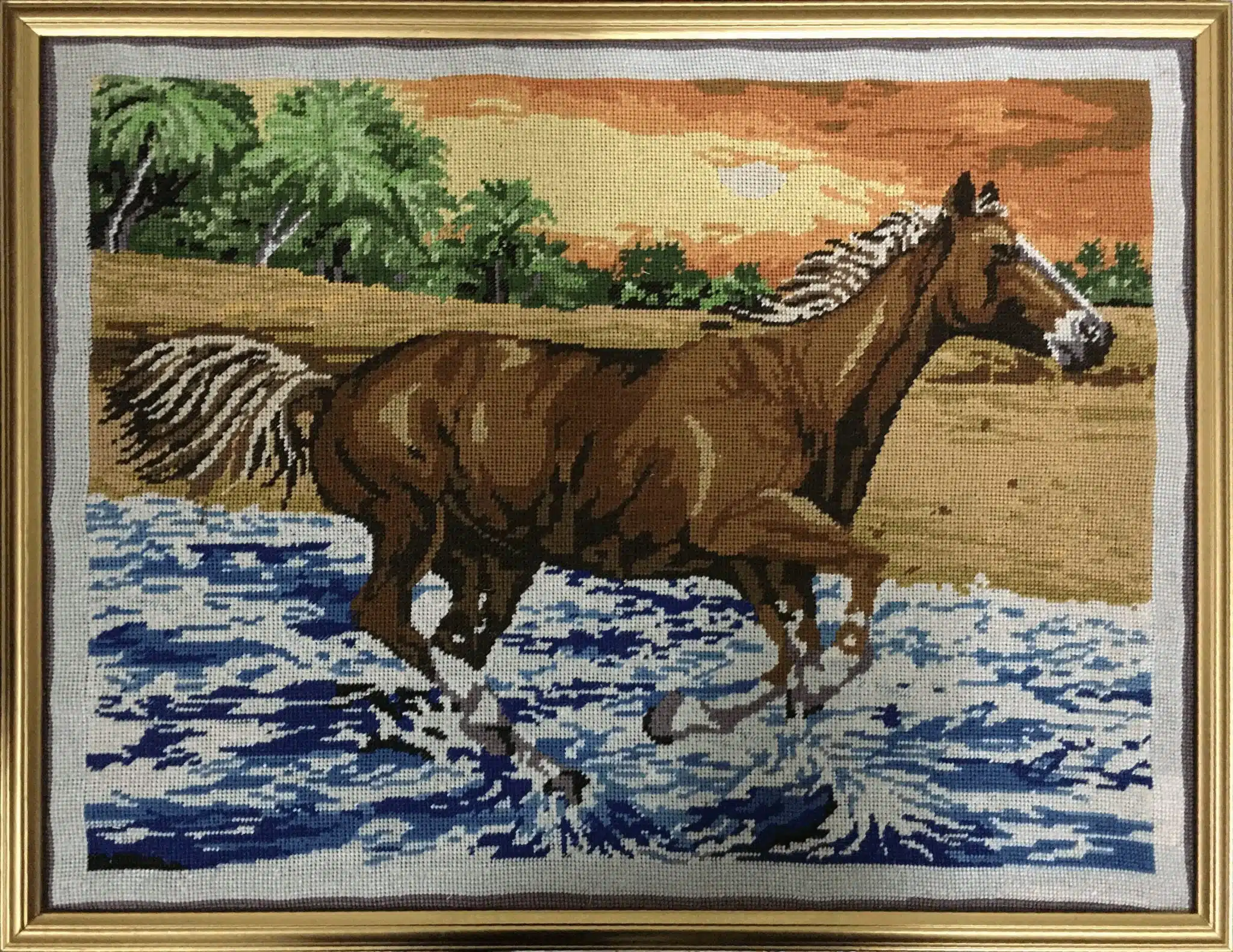 This stunning tapestry features a majestic horse galloping through sparkling water under a vivid sunset sky. The scene is brought to life with intricate details and vibrant colors, capturing the beauty and grace of the horse in motion. Surrounded by lush greenery in the background, the piece evokes a sense of freedom and connection with nature. Framed in a classic gold border, it serves as a perfect centerpiece for any space, blending art and craftsmanship seamlessly.
