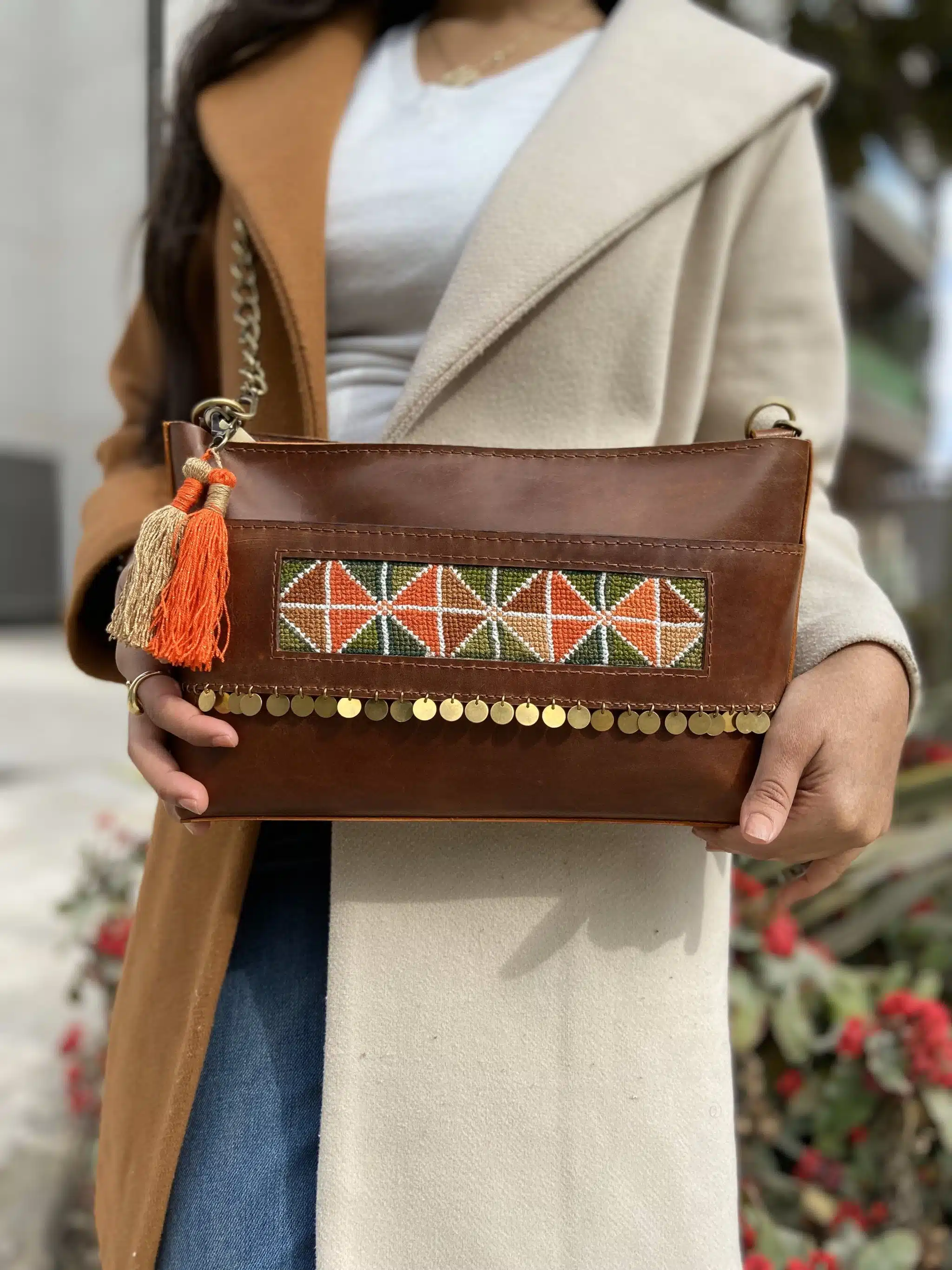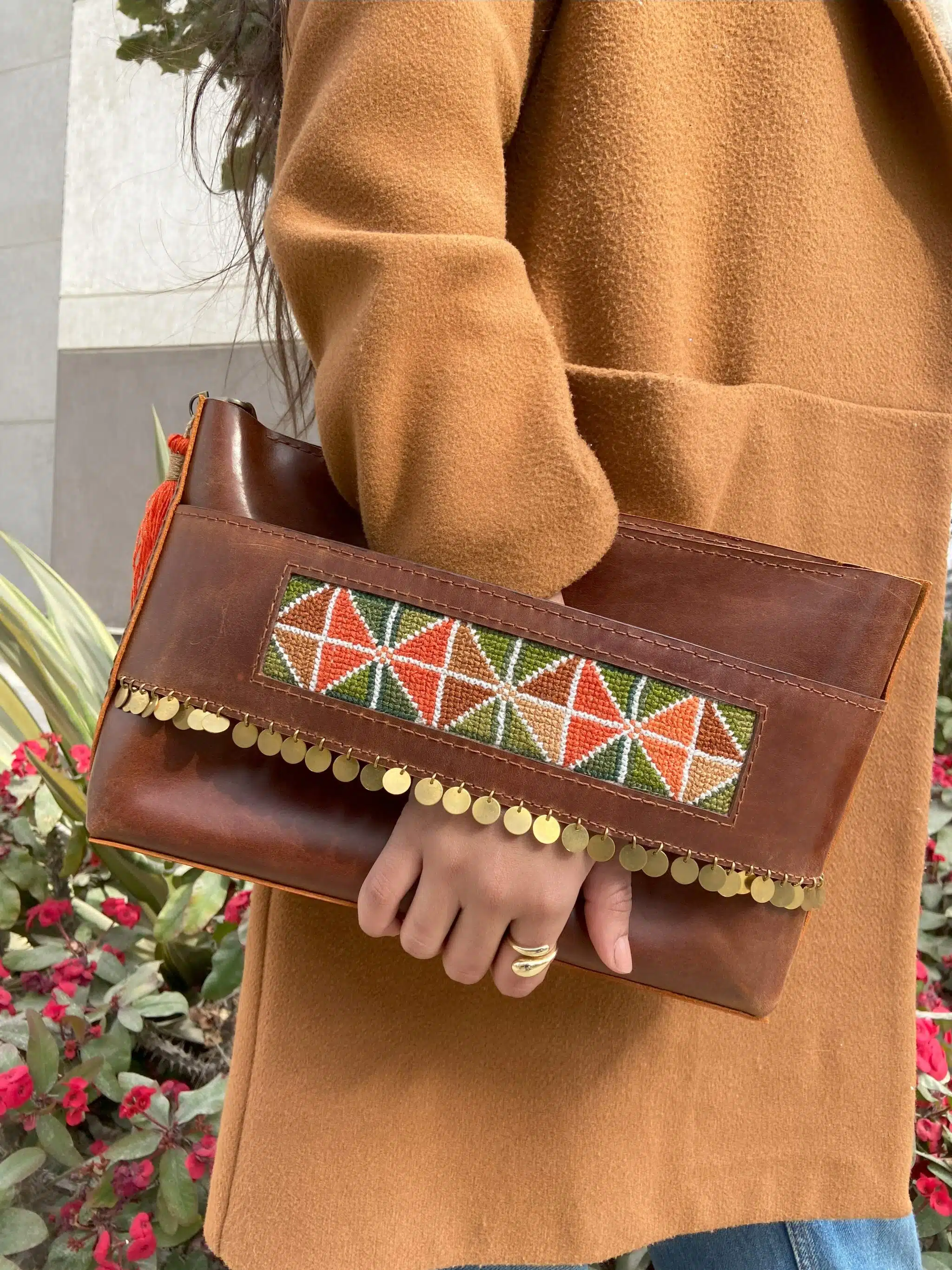 genuine leather clutch bag with metal handle and copper accessories..