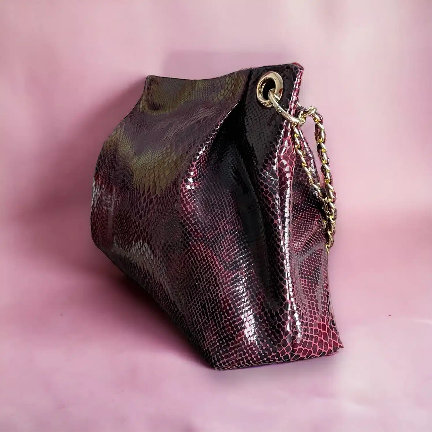 Crafted from high quality lazar genuine leather. Equipped with a chain with leather strap, this accessory can be worn as a shoulder bag