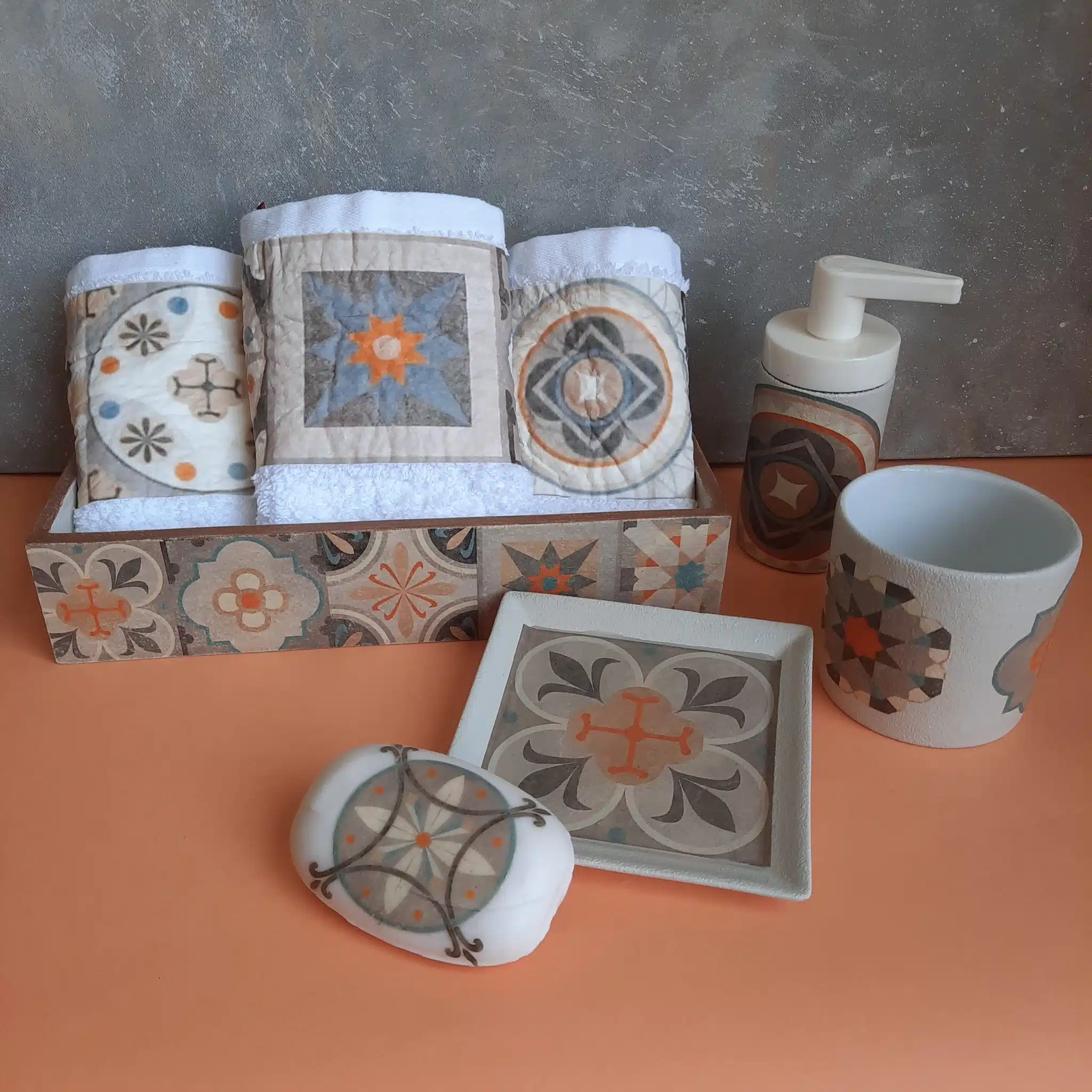 Decoupaged bathroom set consists of plate with soap, dispenser, cup and a box with 3 printed towels size 30×30