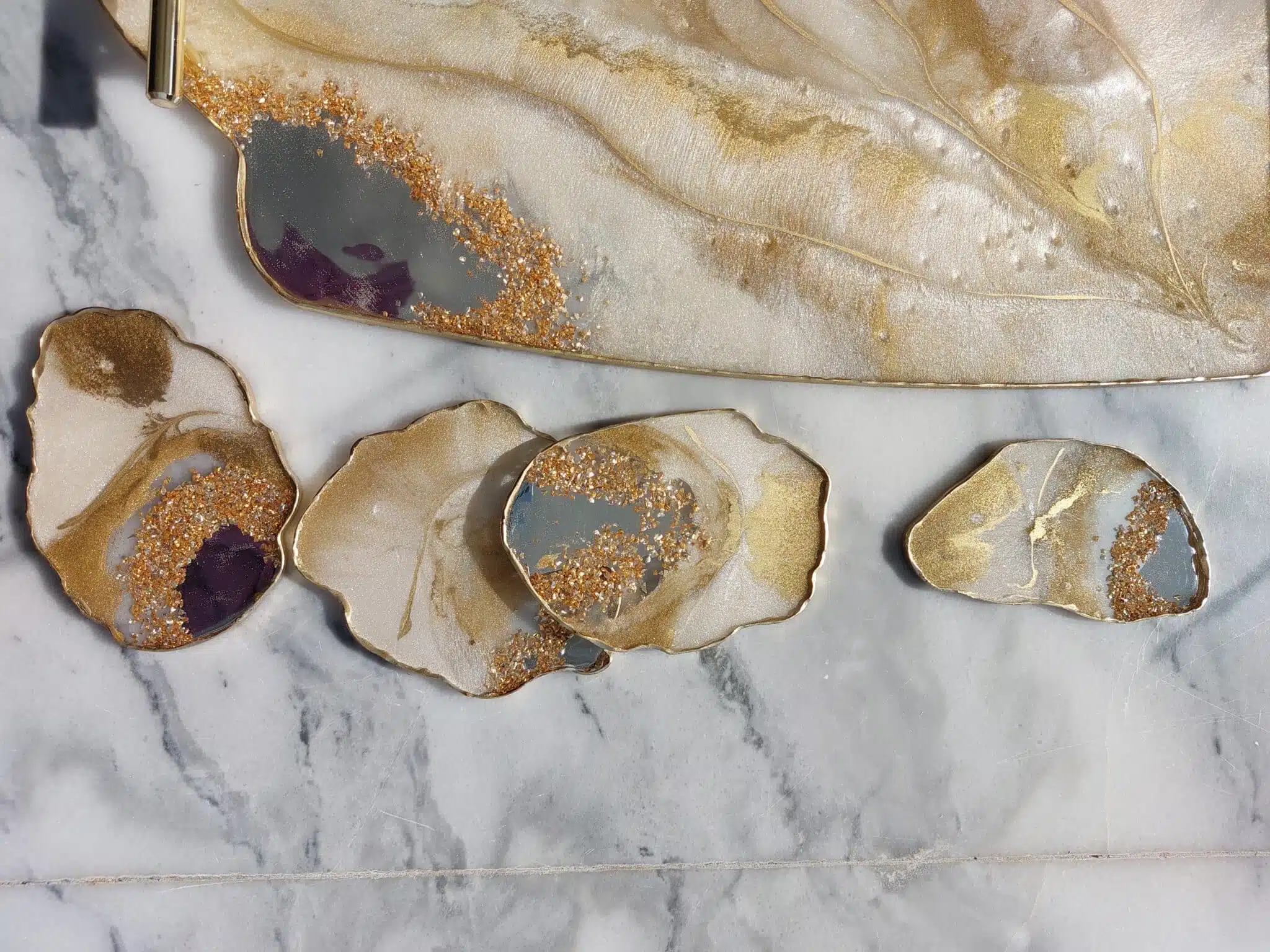 Expecionale Handmade serving coasters set from resin .. inlaid with crystals and stones ..