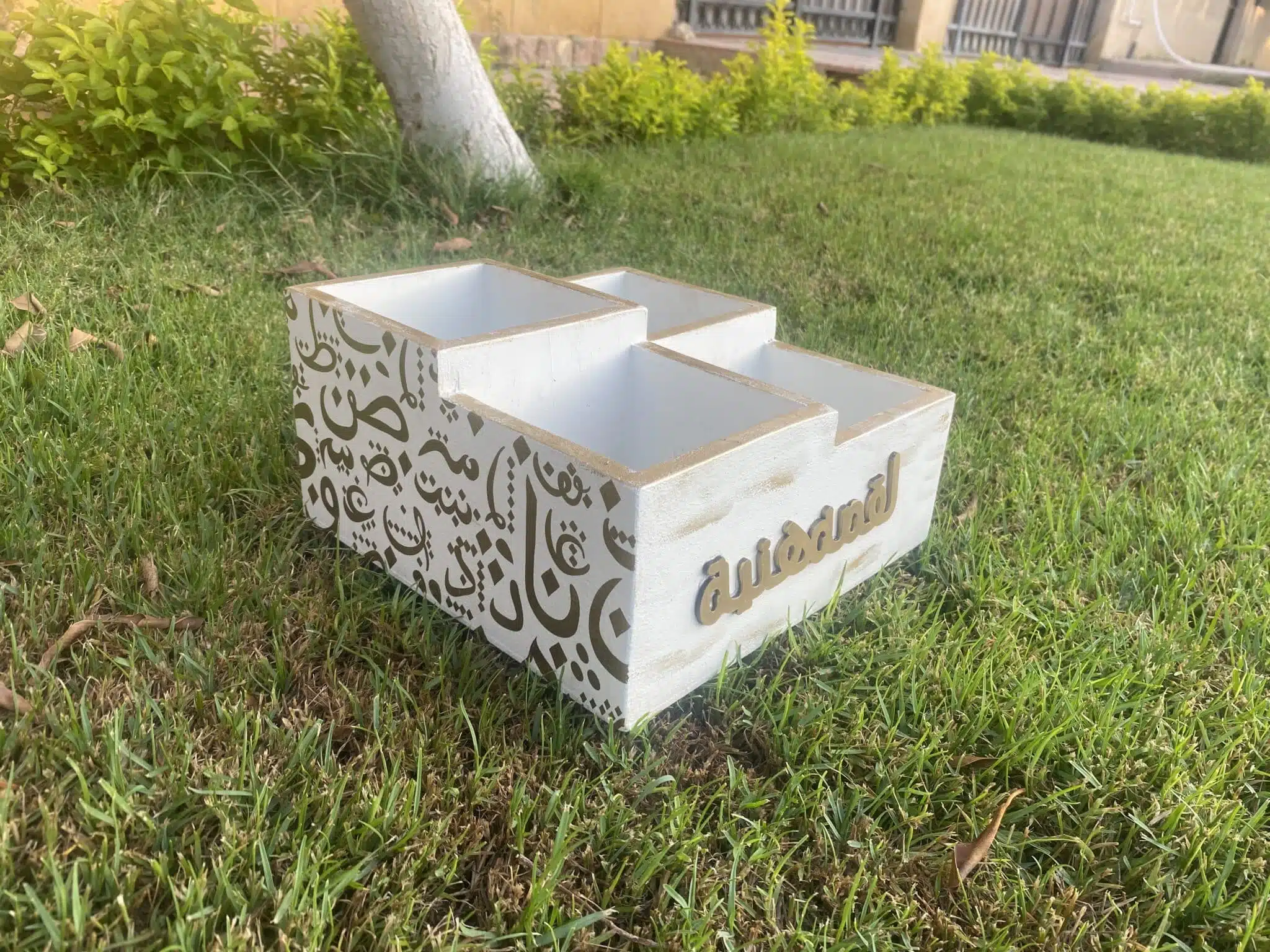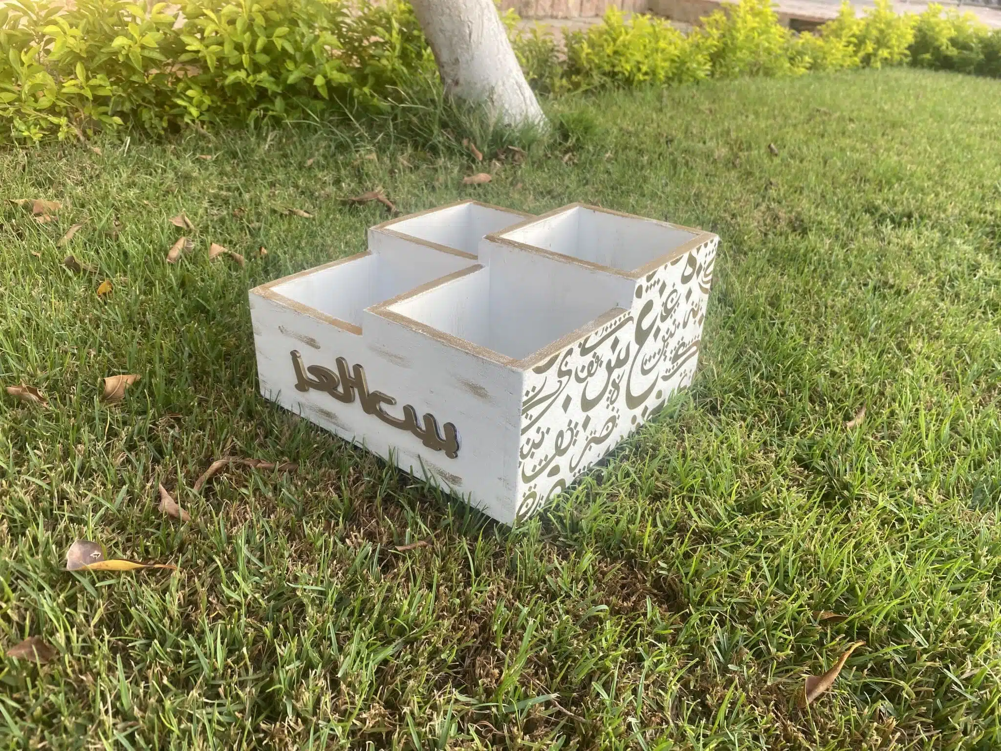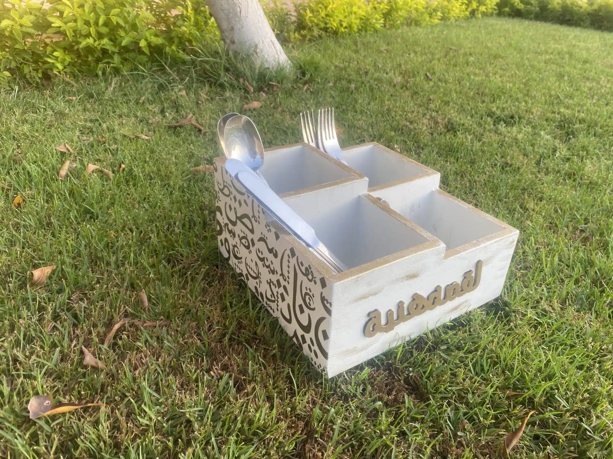 Wooden square cutlery organizer with calligraphy and gold leaf
