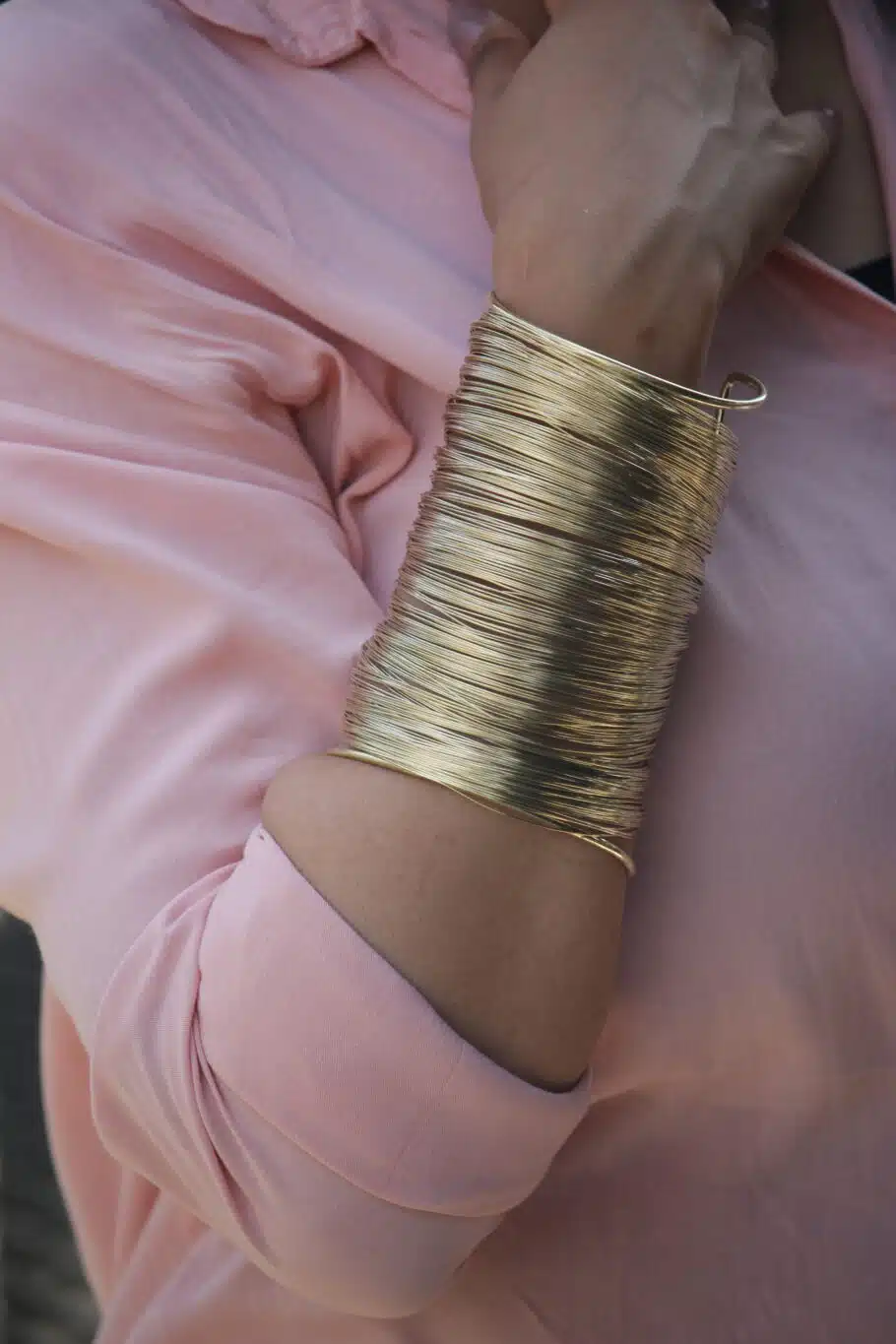 Sleek and striking, Gold Rhythm is a bold arm cuff made from layered gold-toned wire, creating a fluid, textured look. Its stacked design wraps the arm with effortless edge and contemporary charm — perfect for those who love a statement piece with a modern twist.