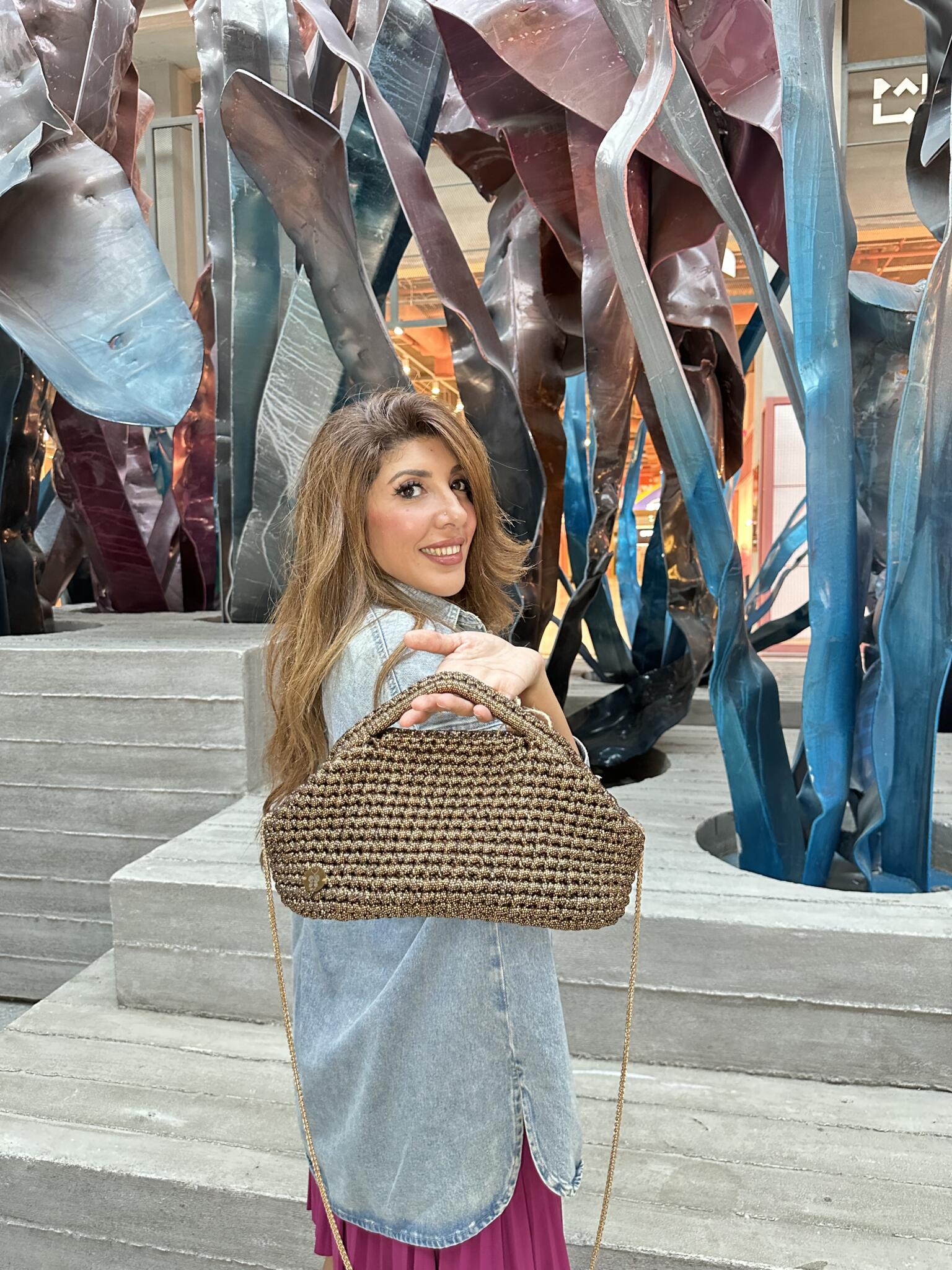 Gold dotted clutch with triangle handle and with a black long strap.
