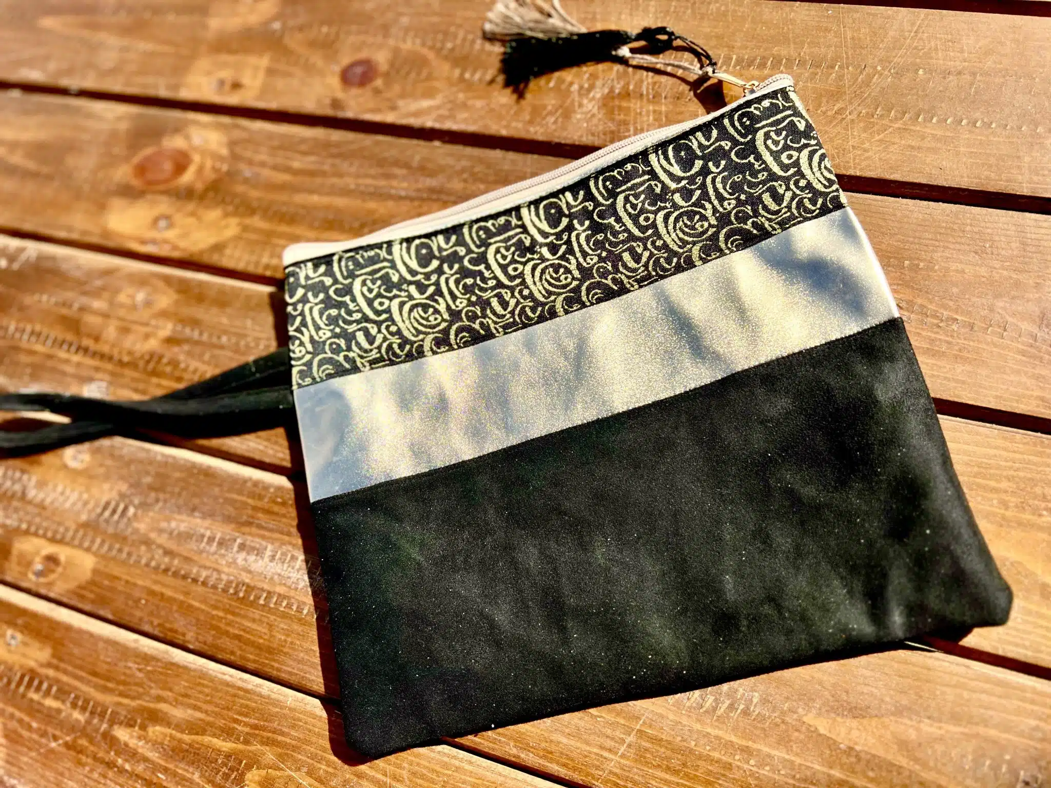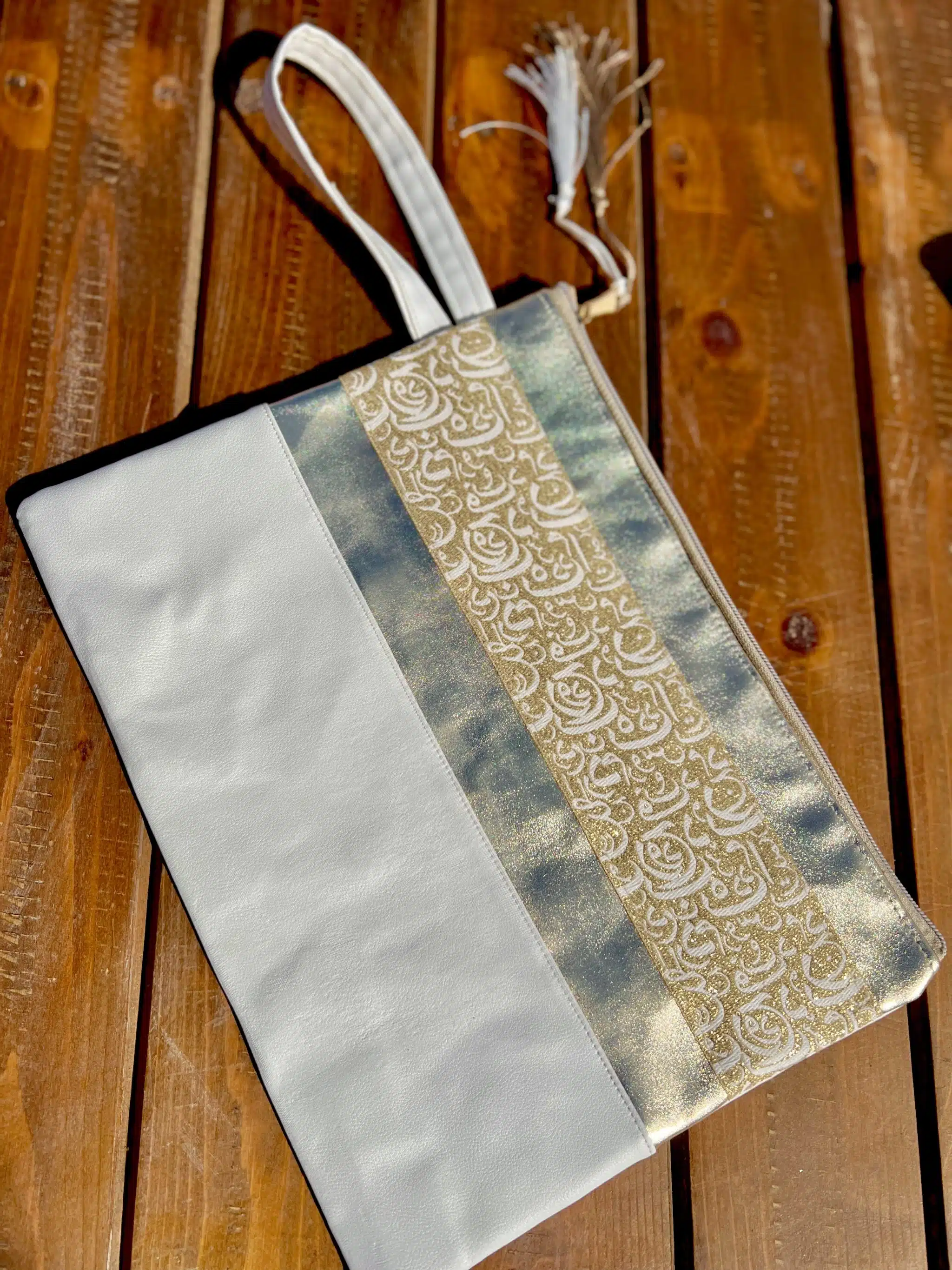 A luxurious handcrafted bag featuring intricate Arabic calligraphy embroidery in shimmering gold tones. The fusion of rich black, white, and metallic gold exudes sophistication, making it perfect for special occasions and elegant evenings.