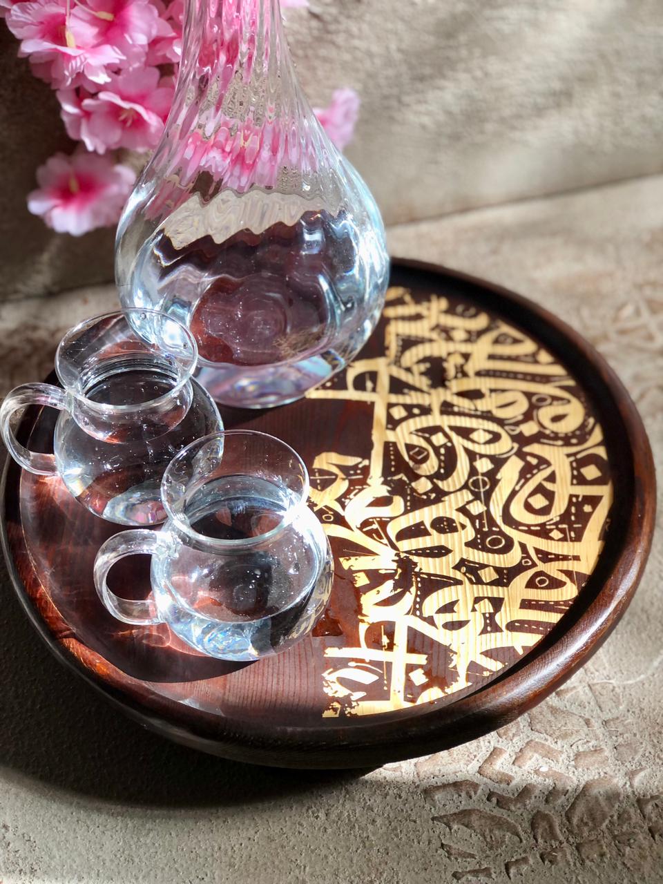 This tray features a distinctive engraved Arabic calligraphy pattern, carefully carved into the wooden surface to create a refined, artistic touch inspired by Islamic heritage.