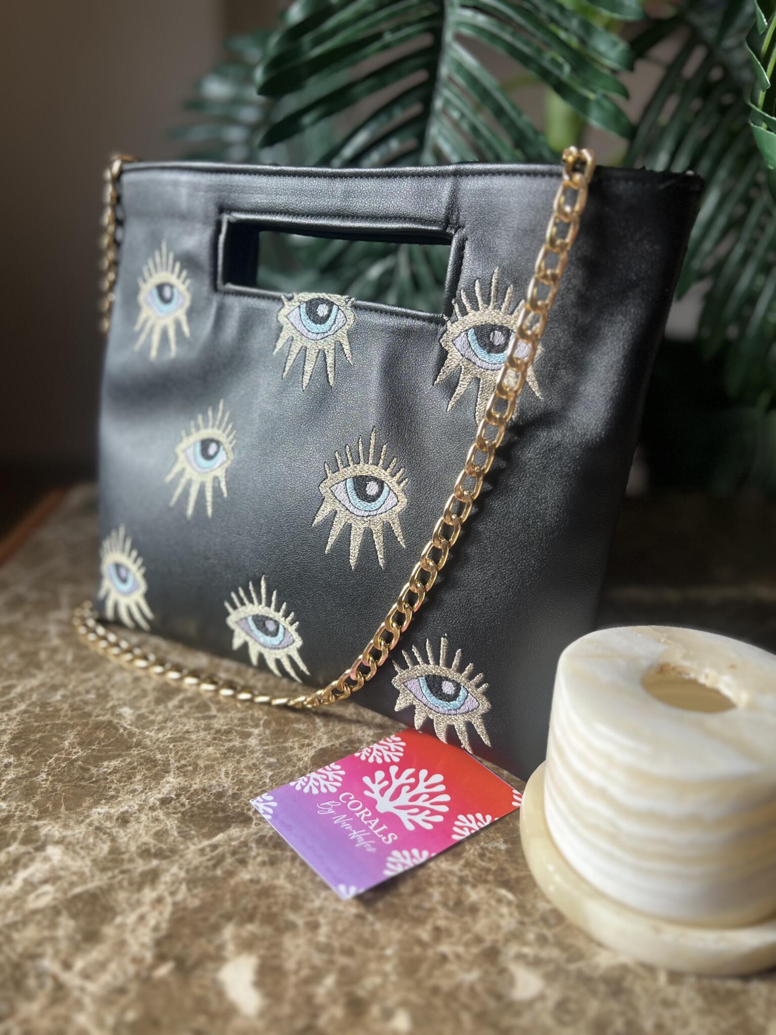 Sophisticated black leather bag with exquisite gold evil eye embroidery and chain strap. A luxurious talisman piece that combines spiritual protection with refined elegance.