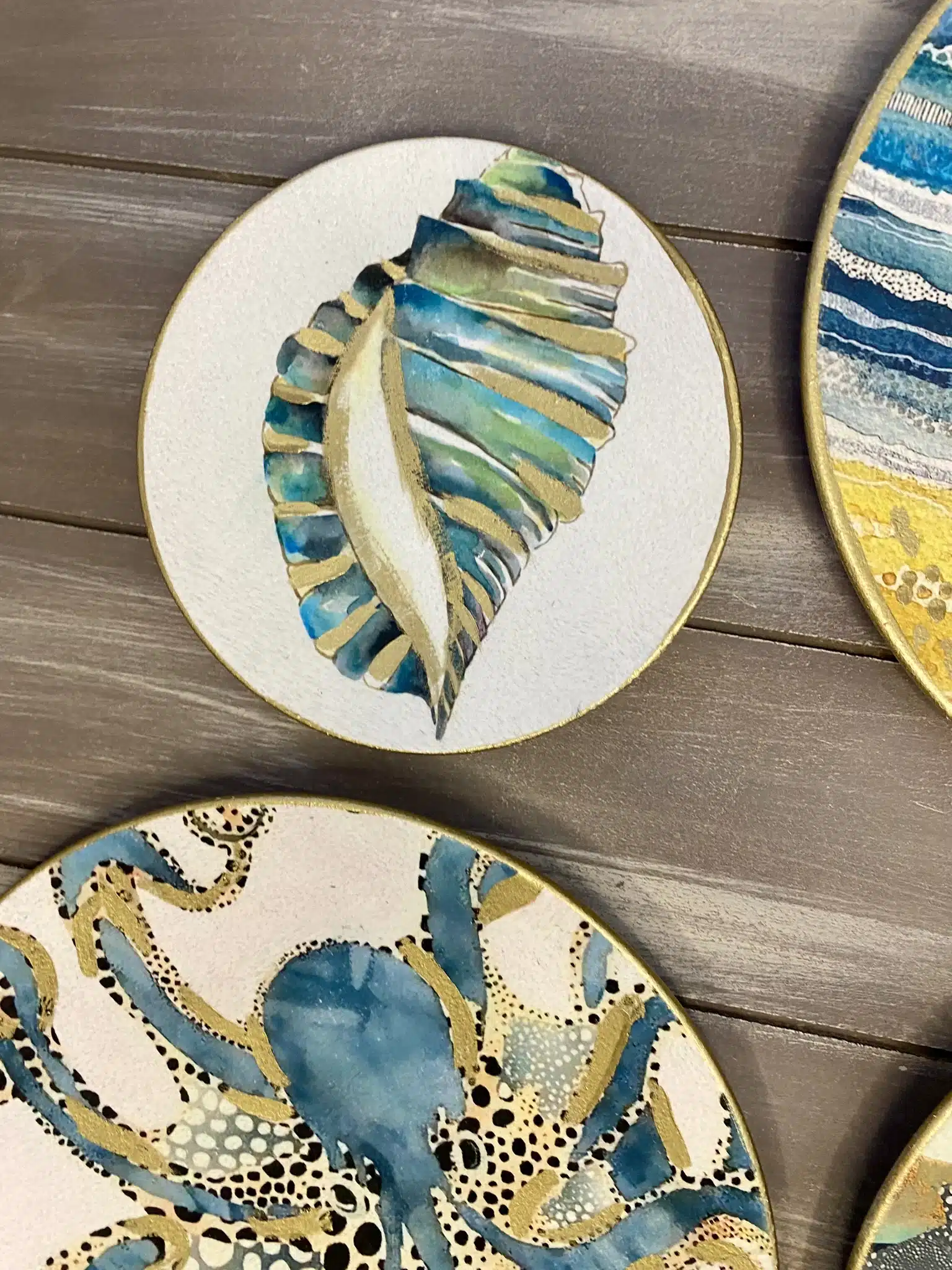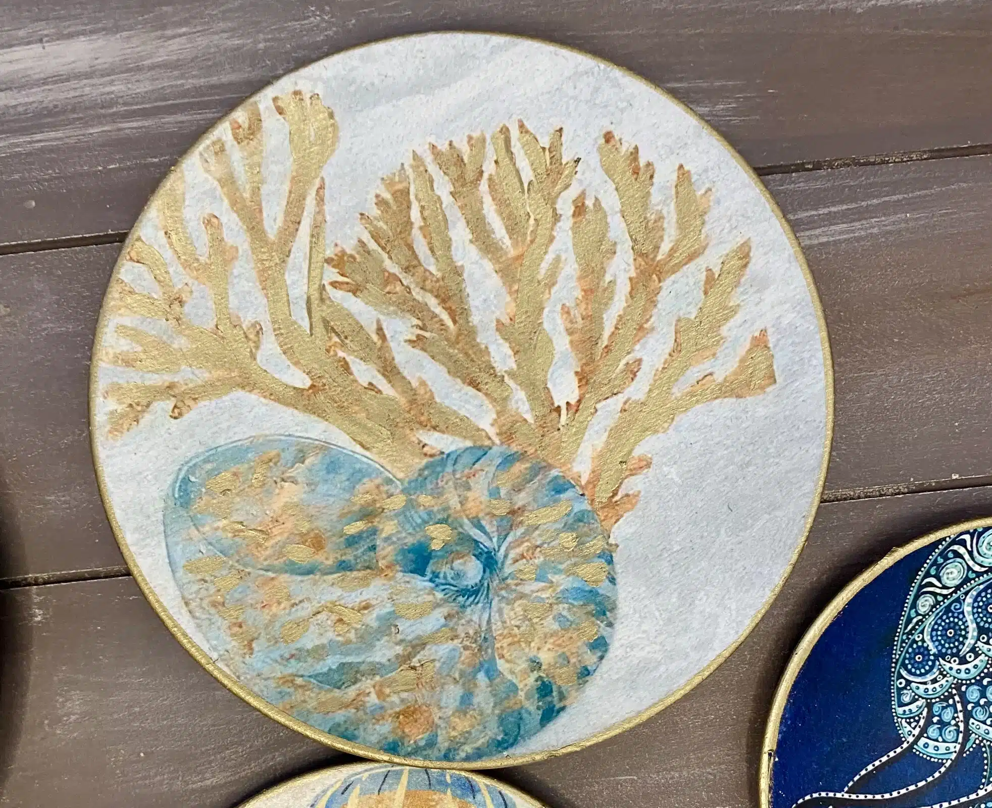 Decoupaged wall plates for summer with touches of gold