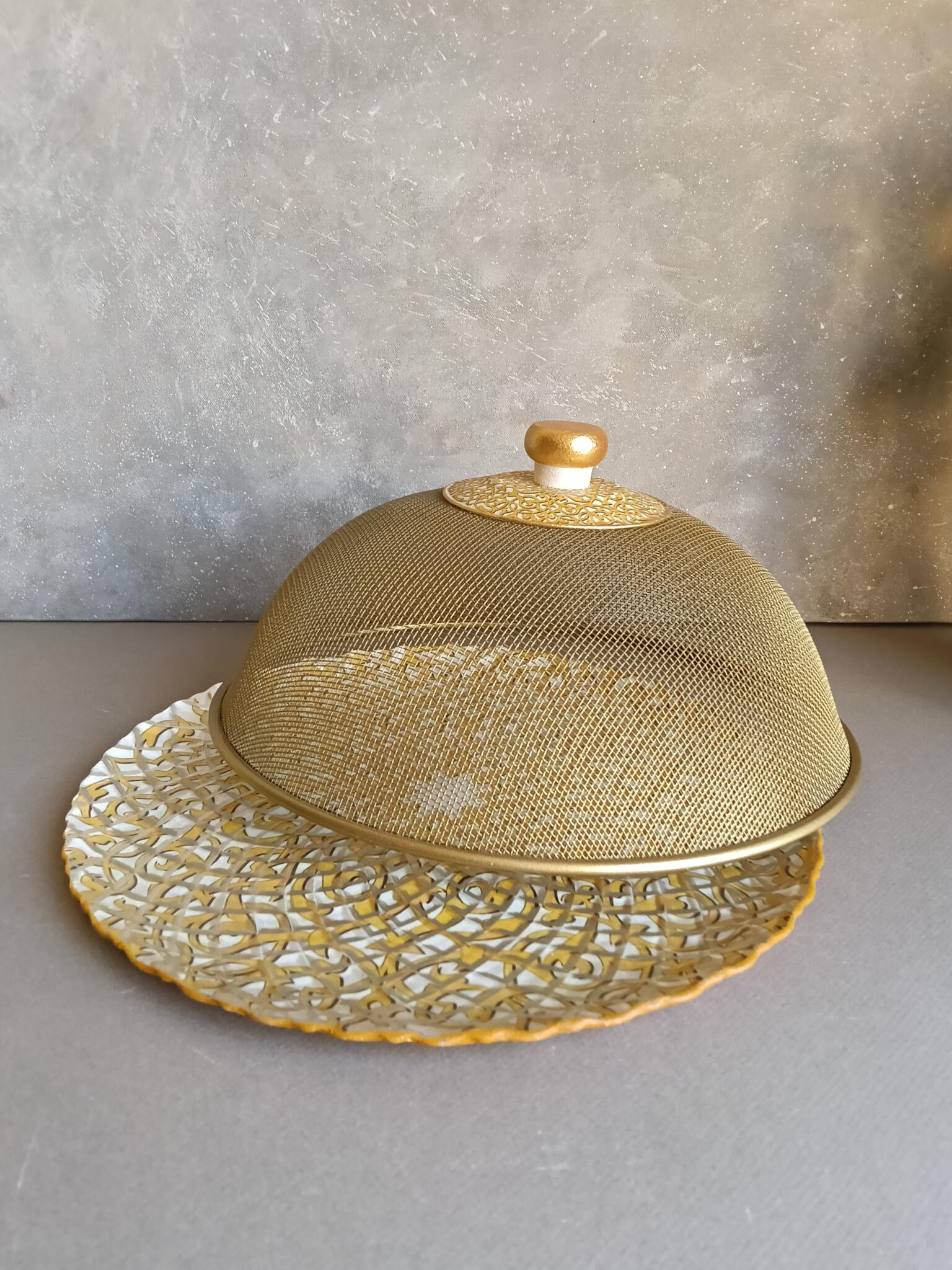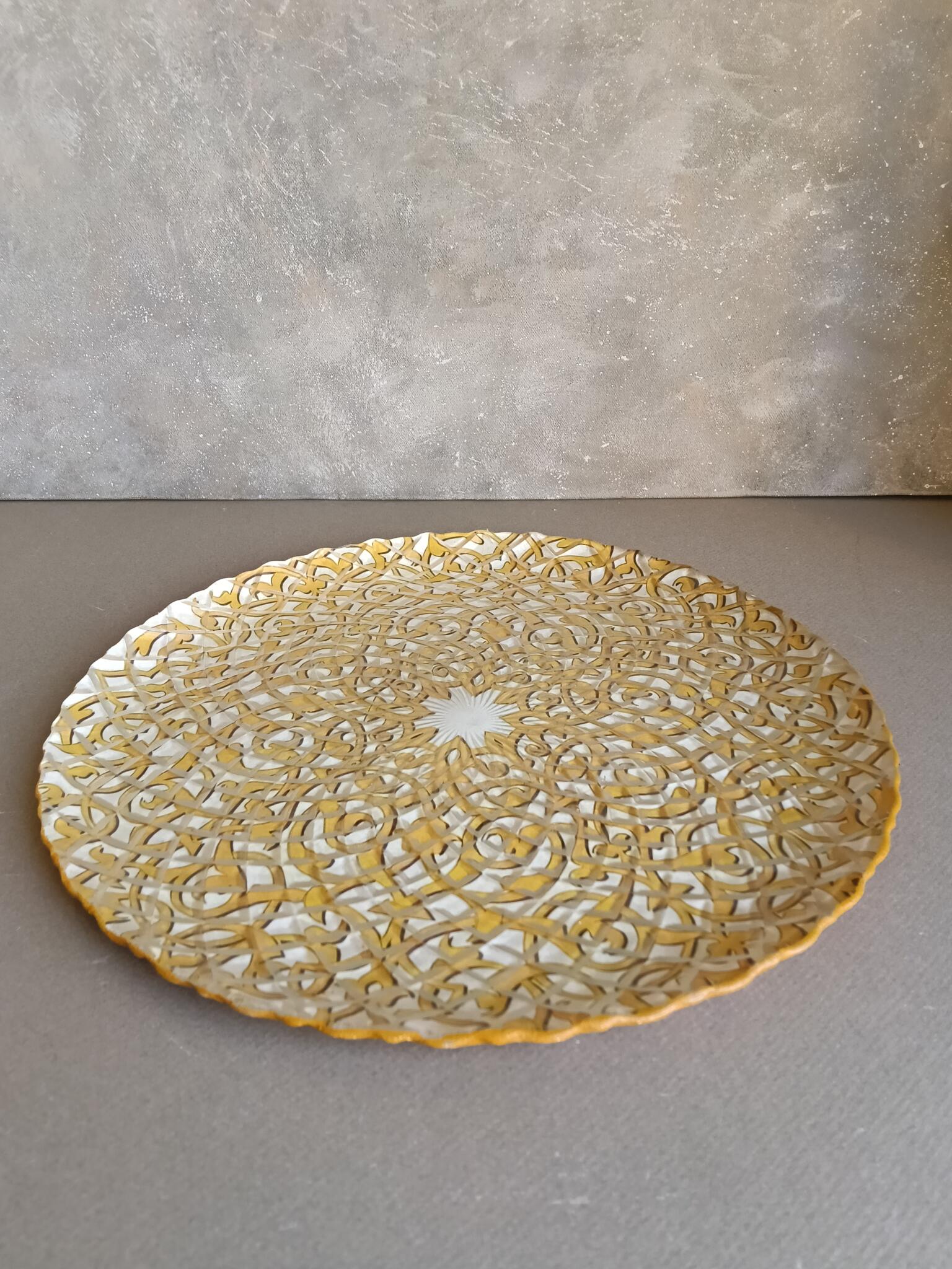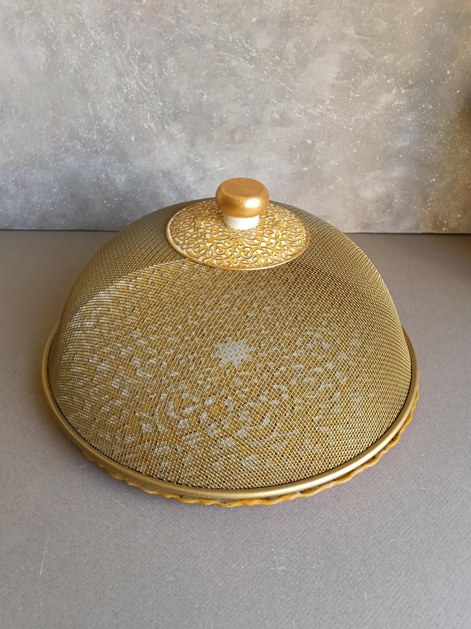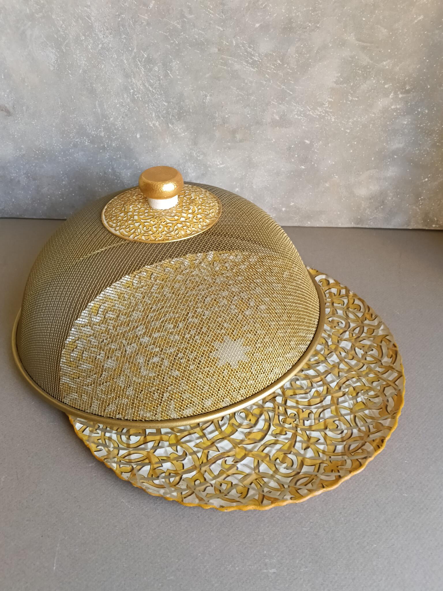 Round glass plate 30 cm decoupaged with a golden arabic pattern has a golden mesh cover with a matching knob