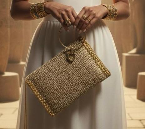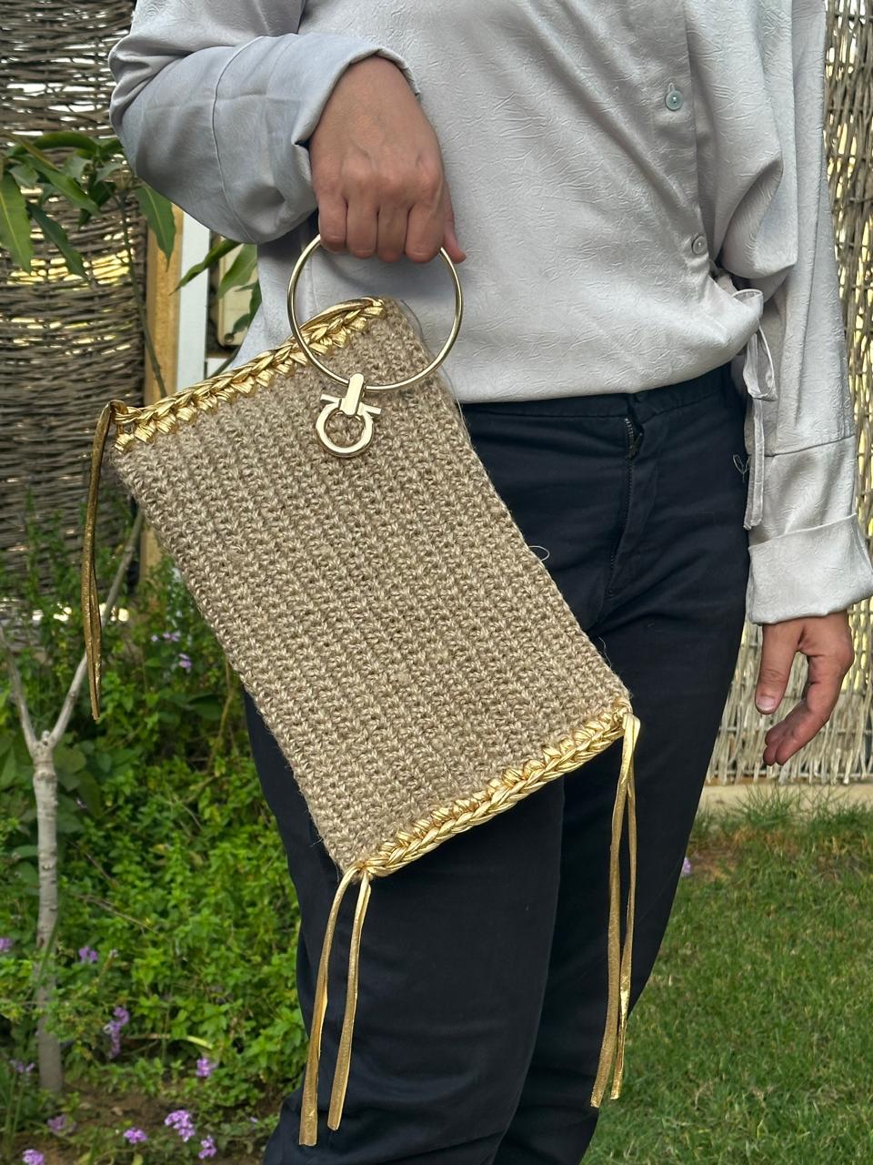A handcrafted crochet burlap clutch in a warm sandy shade, finished with eye-catching golden details and a bold metal ring accent. Stylish, lightweight, and perfect for elevating both casual and evening looks.