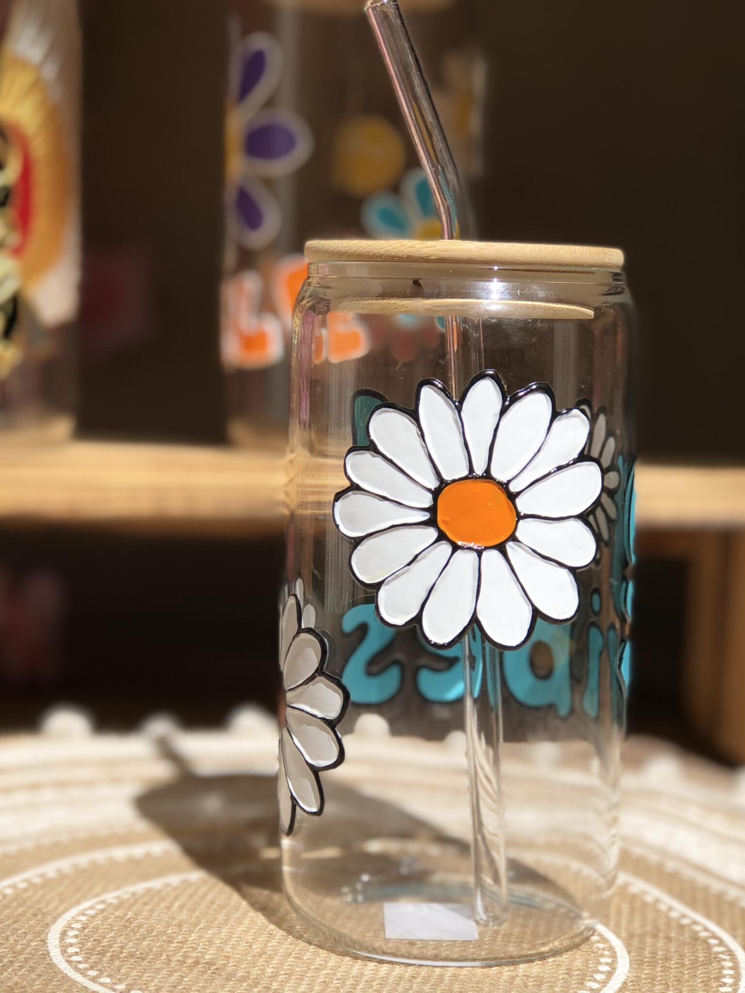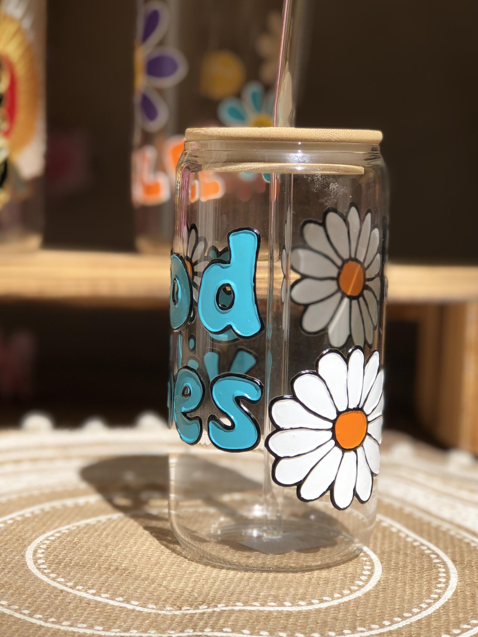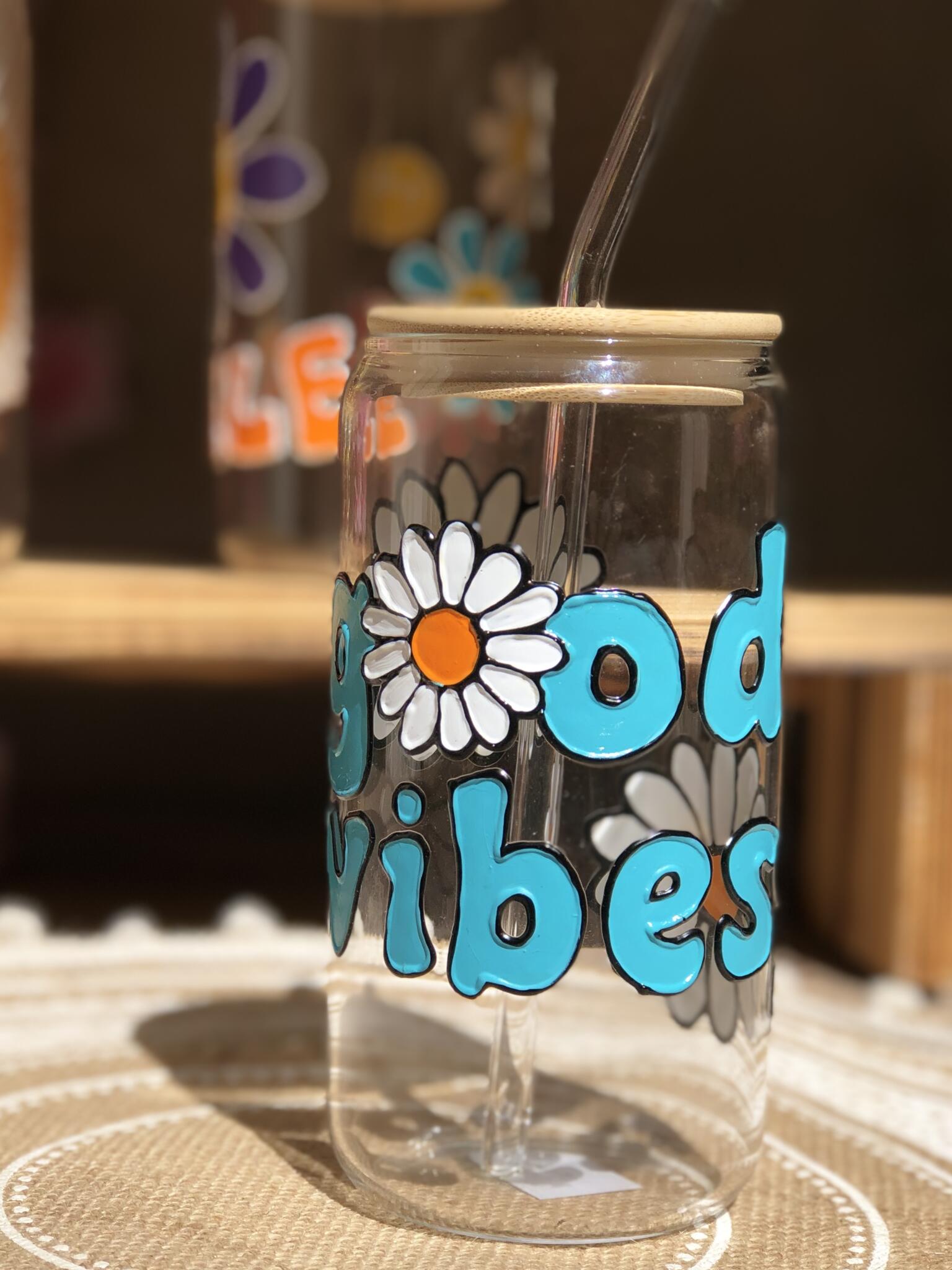 Hand painted good vibes (caption) colored with turquoise colo and decorated by random jasmine flowers