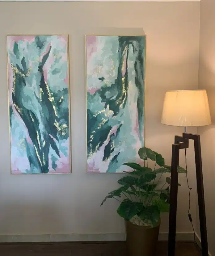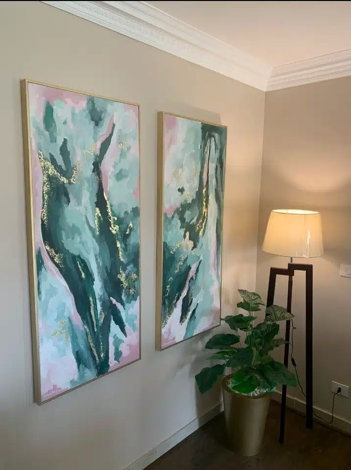 Two acrylic paintings with gold leafs framed by modern gold frame .