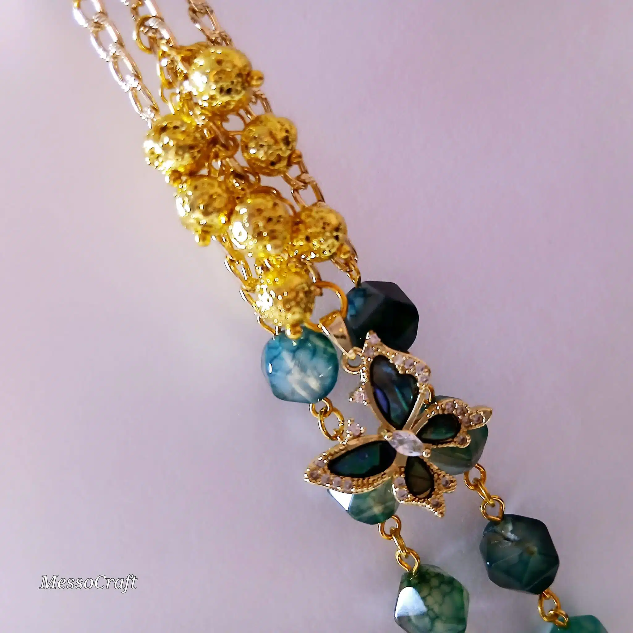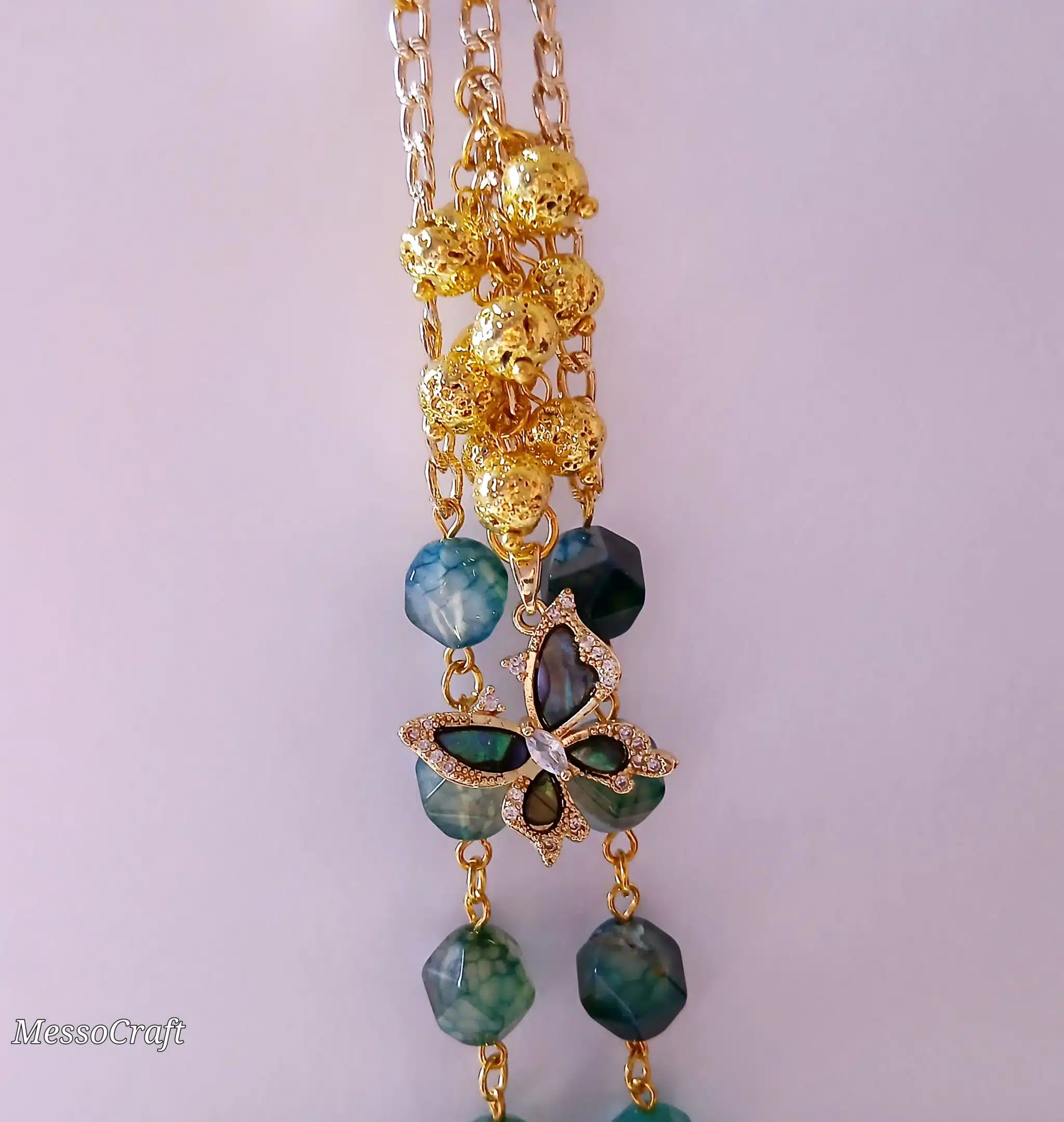 Bag charms made of green agate and golden hematite stones and hanged a plated green pendant in the shape of a butterfly with Chinese gold chains