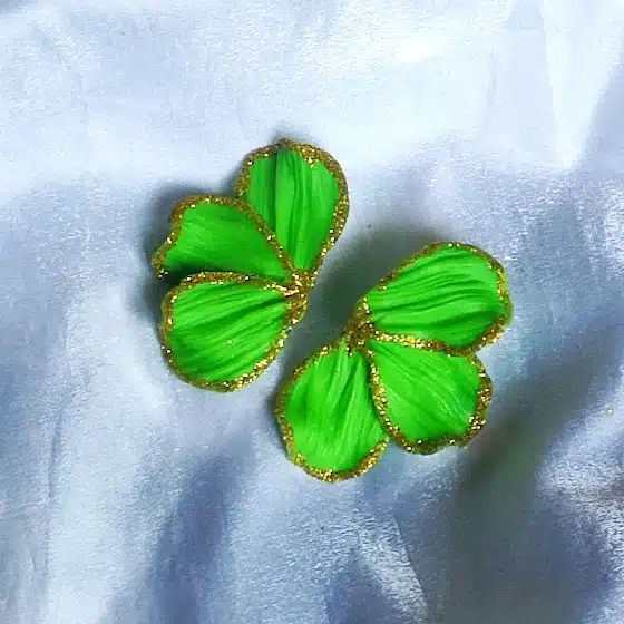 مصنوع من بوليمر كلاي بلون أخضر زاهي، مزين بخطوط جليتر ذهبي تضيف لمعة ناعمة.
