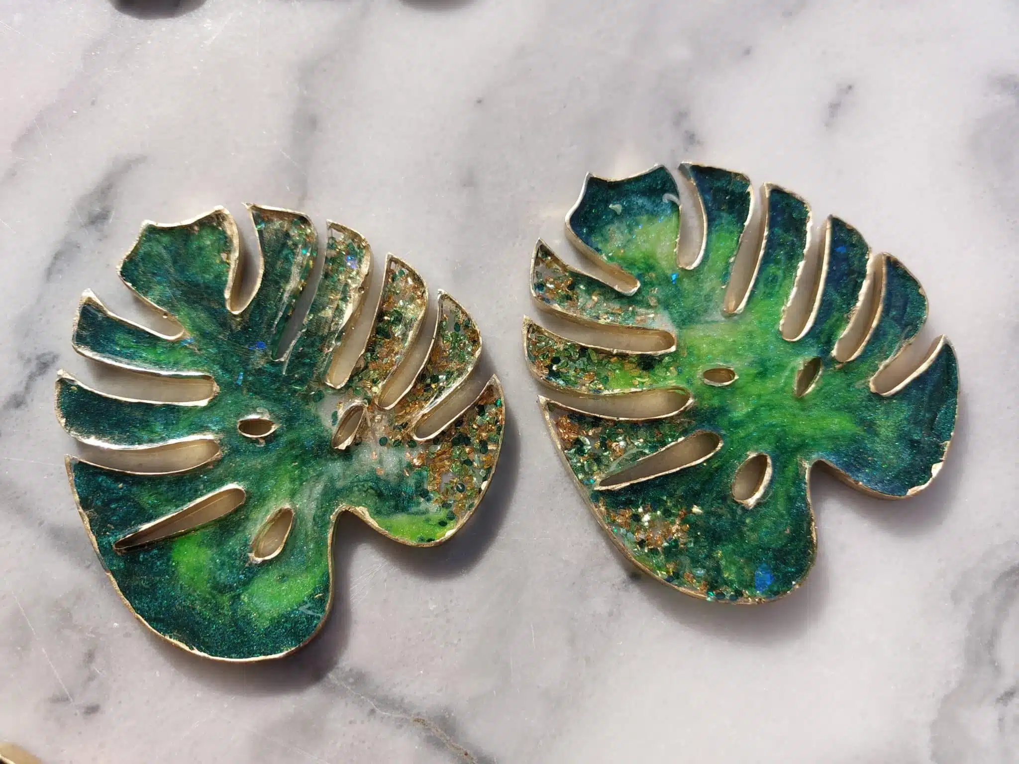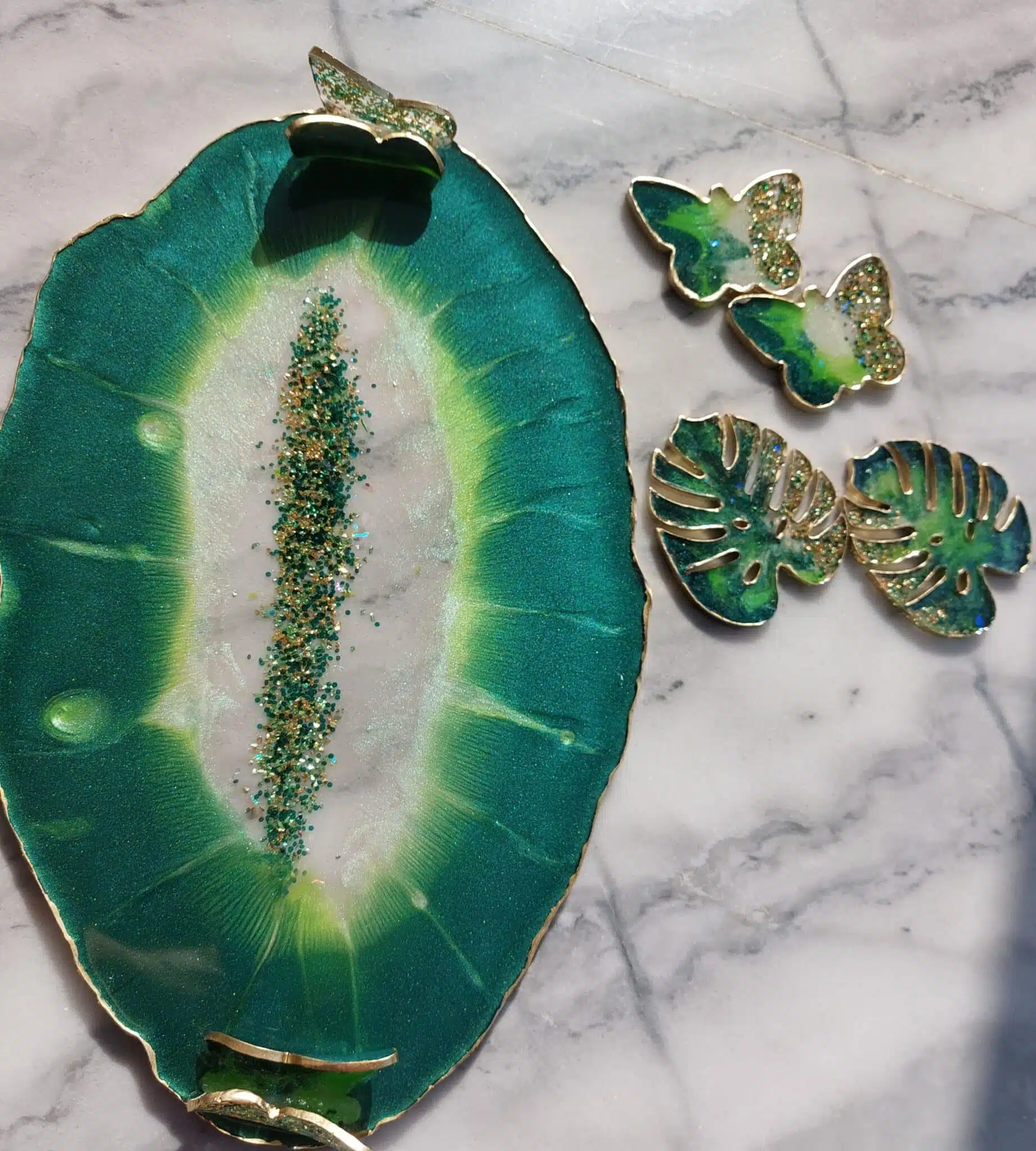 Handmade serving coasters set from resin .. inlaid with stones and include silver reflective sticker