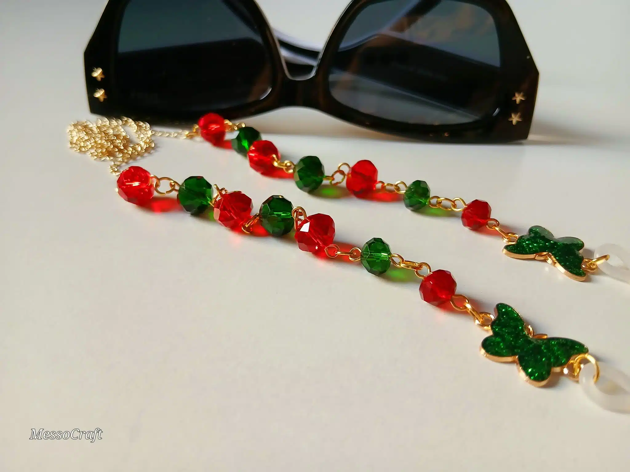 Glasses chain in green / Red crystal stones with a butterfly pendant in a unique style