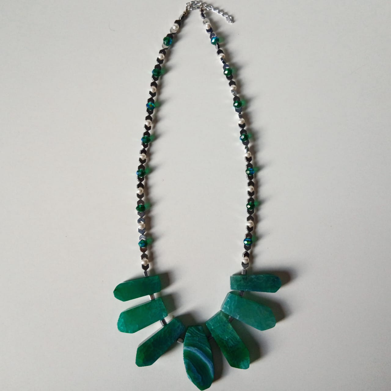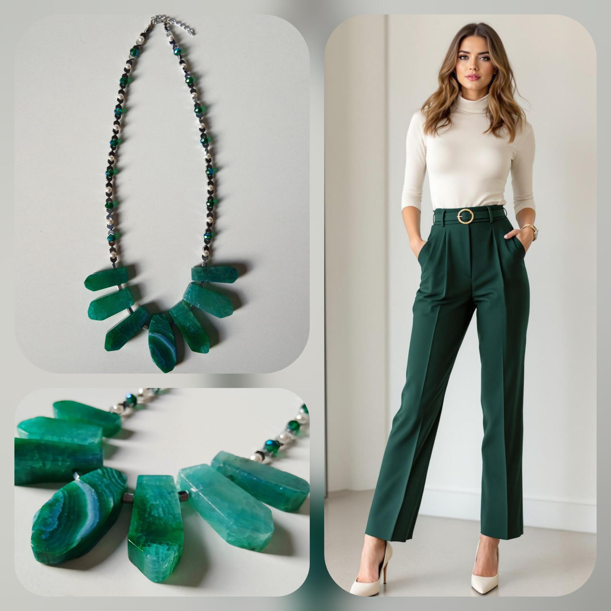 A statement necklace made of big green gemstones and hematite beads along with pearls and crystal stones