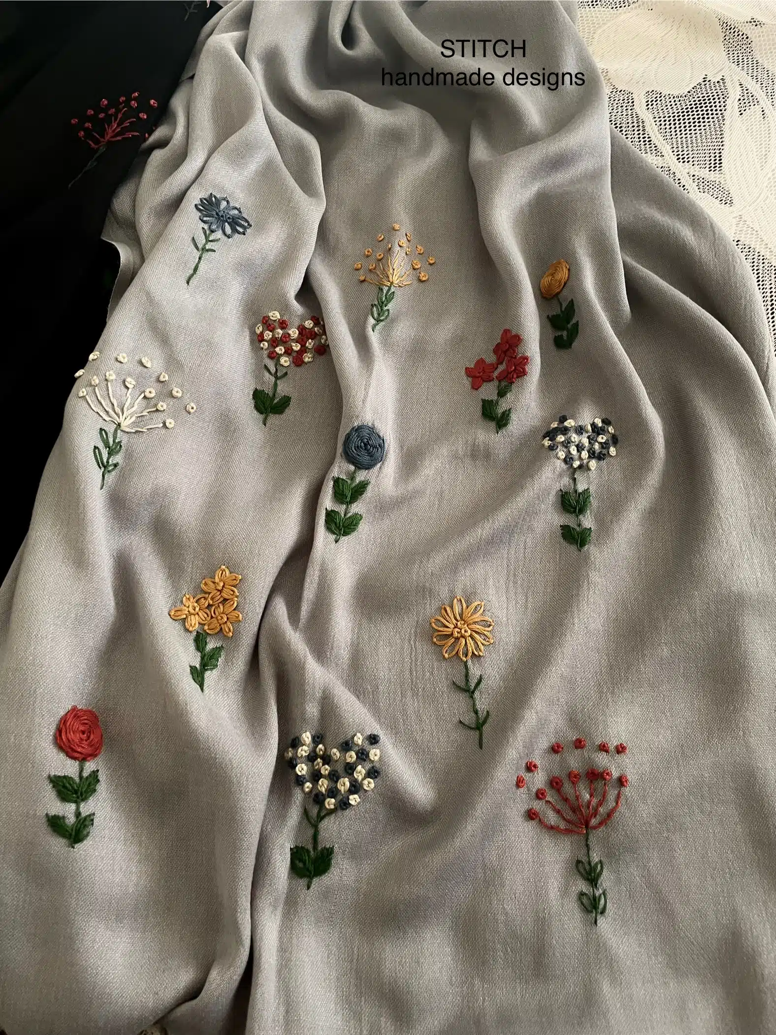 This product name emphasizes the vividness of the flowers on the black scarf. It suggests a sense of playfulness and joy, while still maintaining the elegance of a hand-embroidered pashmina shawl.