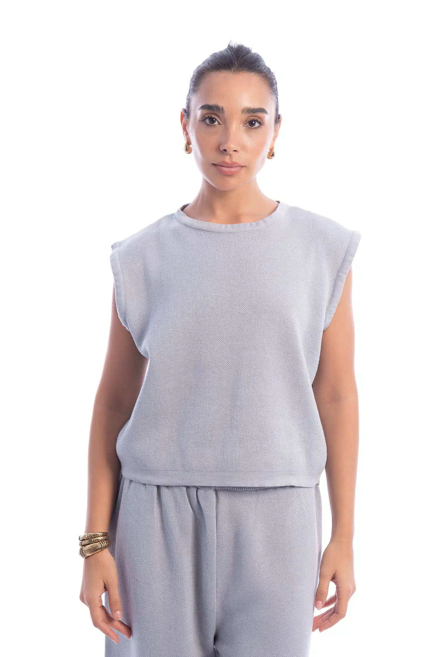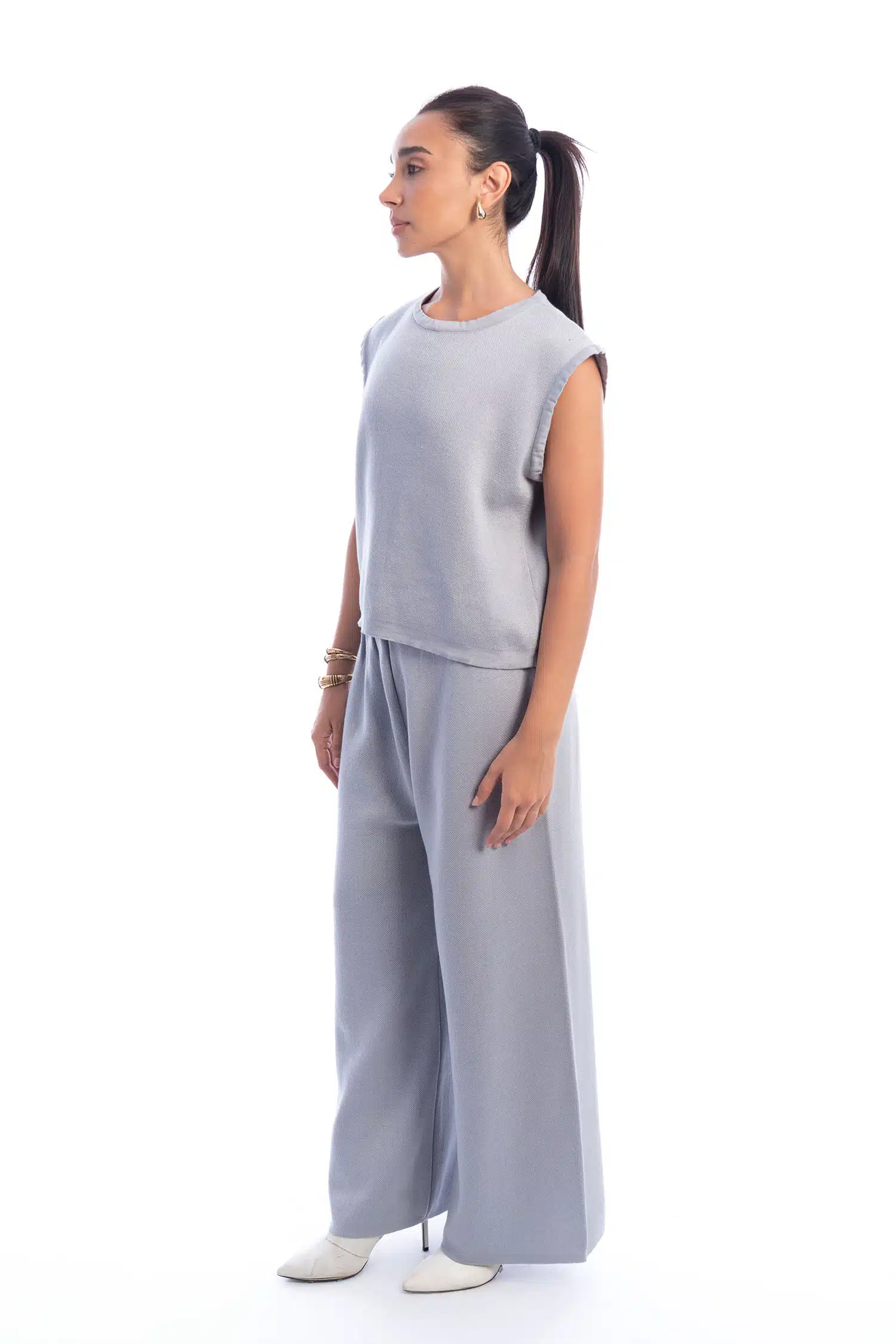 knit sleeveless top, can be combined with its matching pants and cardigan to create a stylish winter set