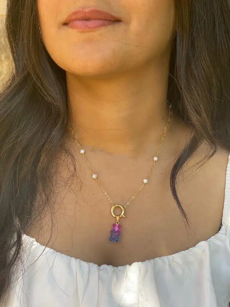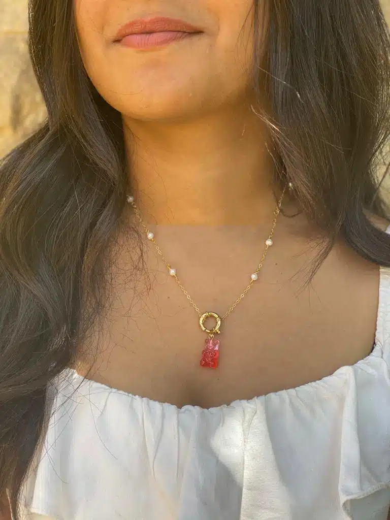 Pure 925 silver platted in 18 k gold with the blend of real pearls and your gummy bear choice Necklace