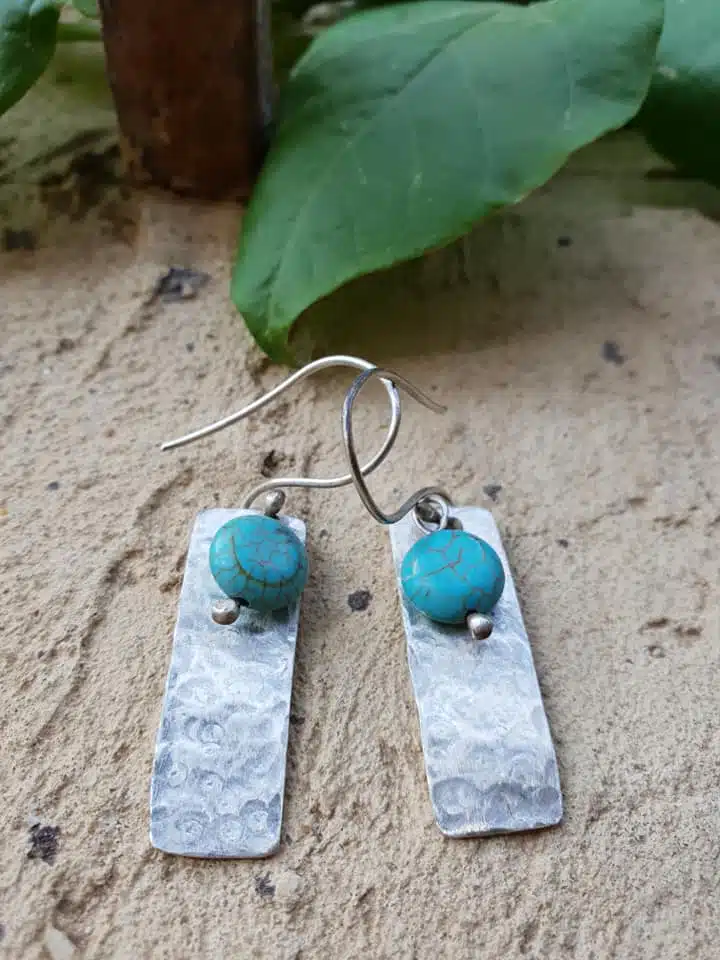 Hammered rectangular sterling silver earring with dangling turquoise. It has separate matching bracelet and ring.