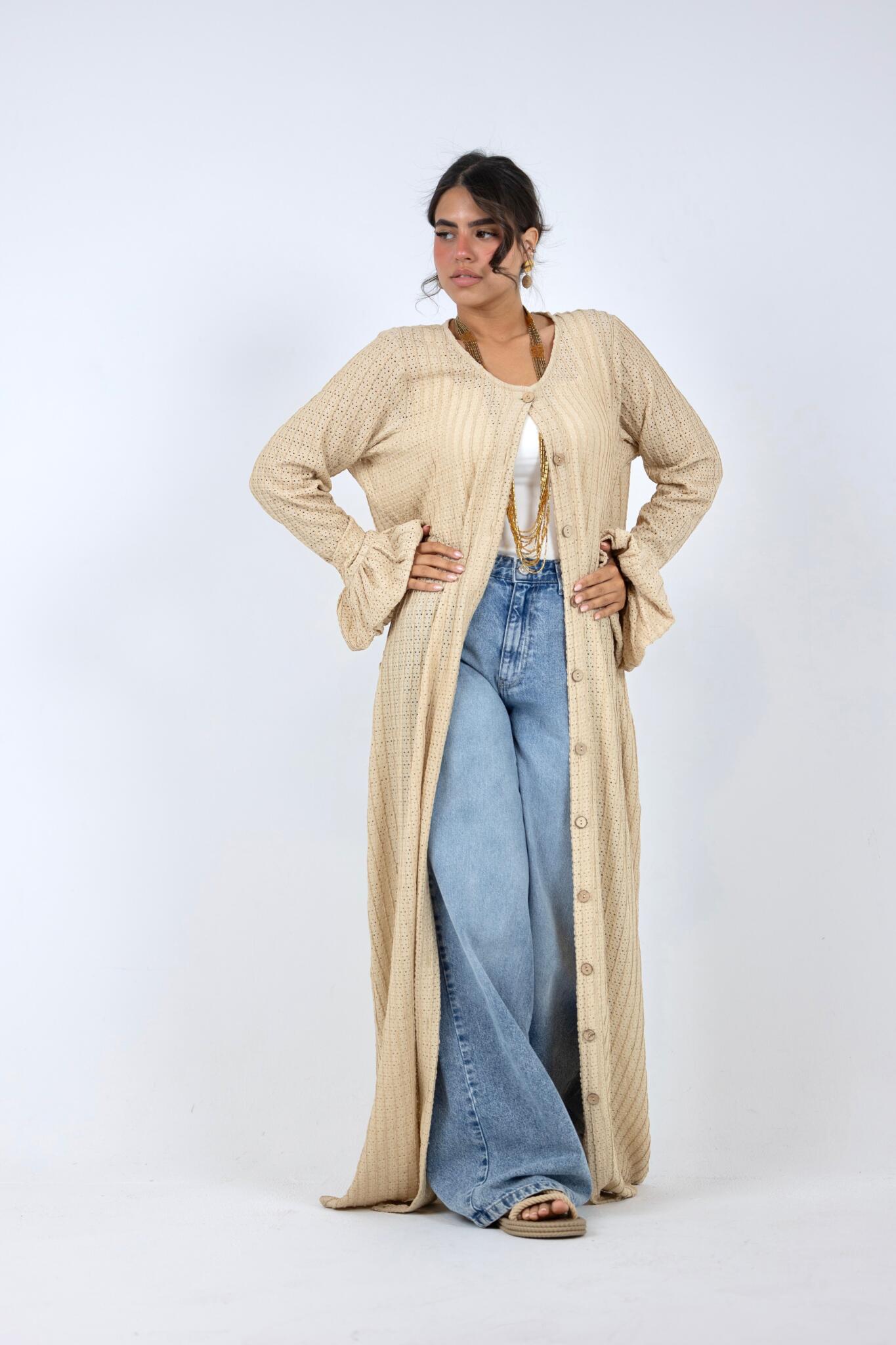 Elevate your summer style with our Lightweight Textured Cardigan, the perfect piece for chic, effortless layering. This cardigan features a beautiful, crinkled texture and a long, flowing silhouette that drapes gracefully. The statement sleeves are a unique touch, with a flared, ruffle-cuff detail that adds a touch of romantic flair.