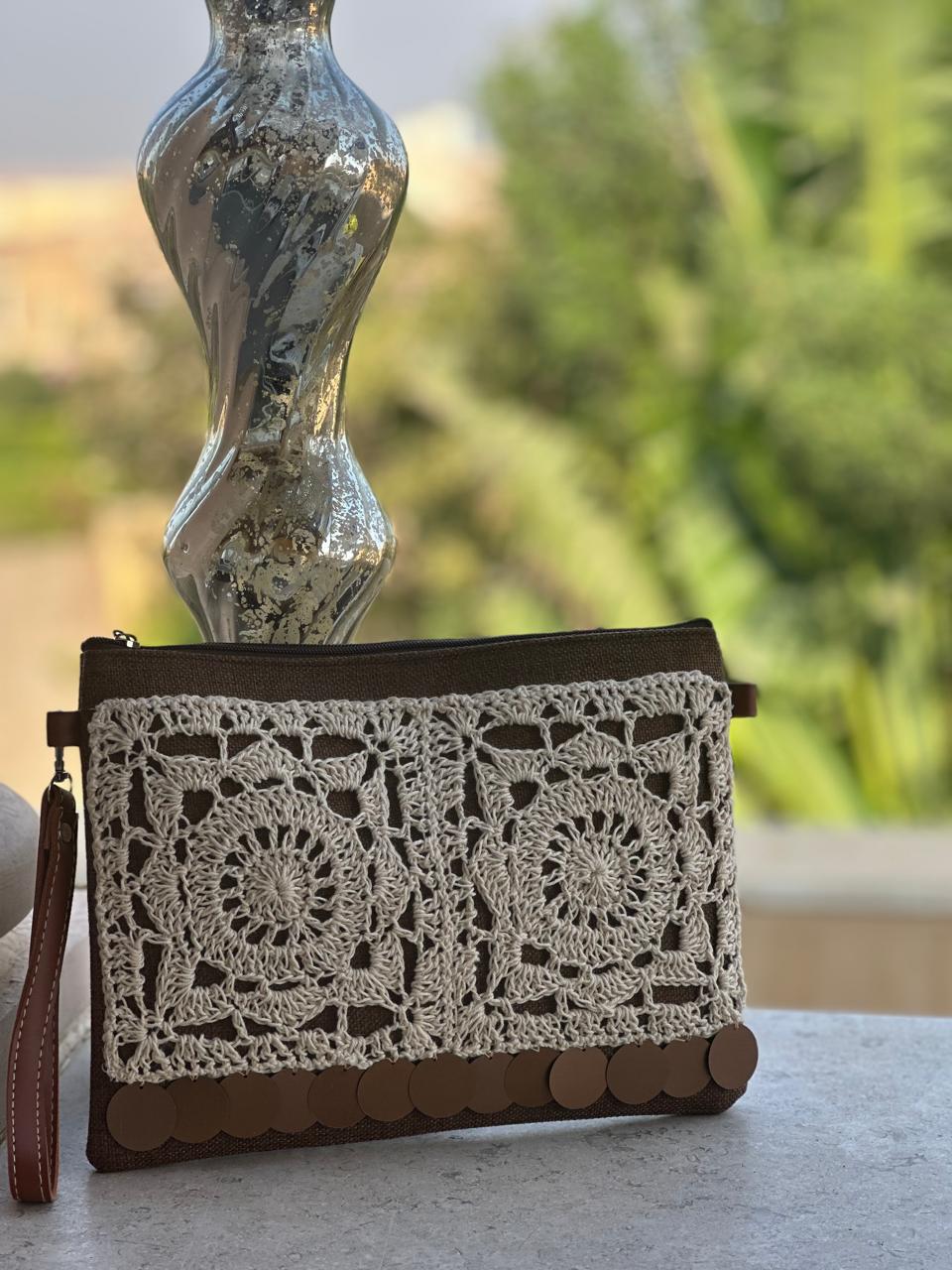 A rich brown clutch detailed with hand-crocheted lace panels and earthy accents
