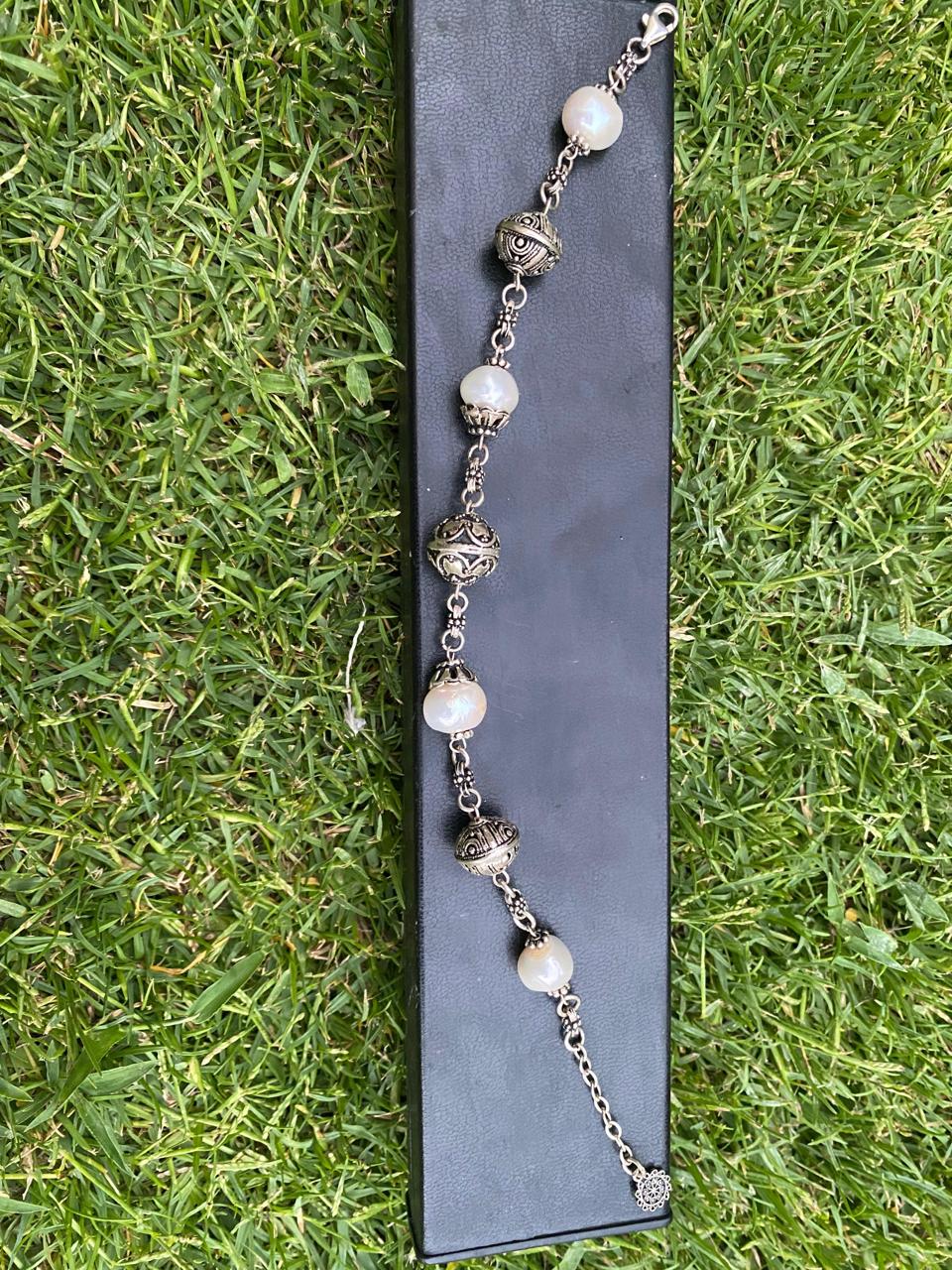 This handmade 925 Silver bracelet is designed with natural pearls paired with ornate silver stones, creating a balanced design that blends softness with a bold, handcrafted touch.