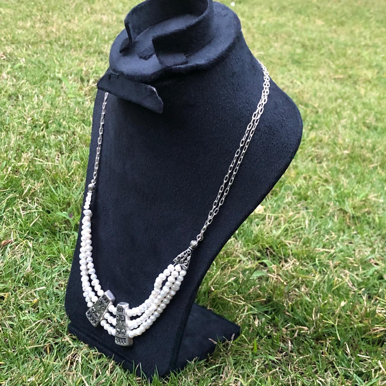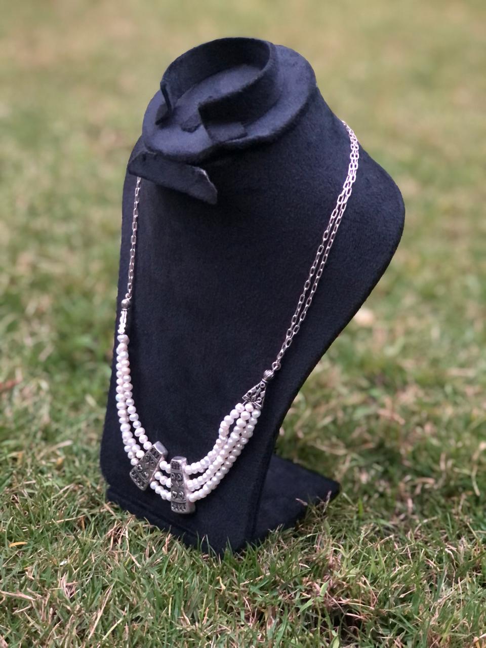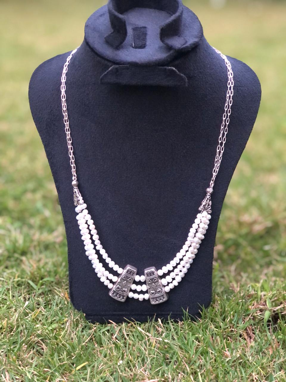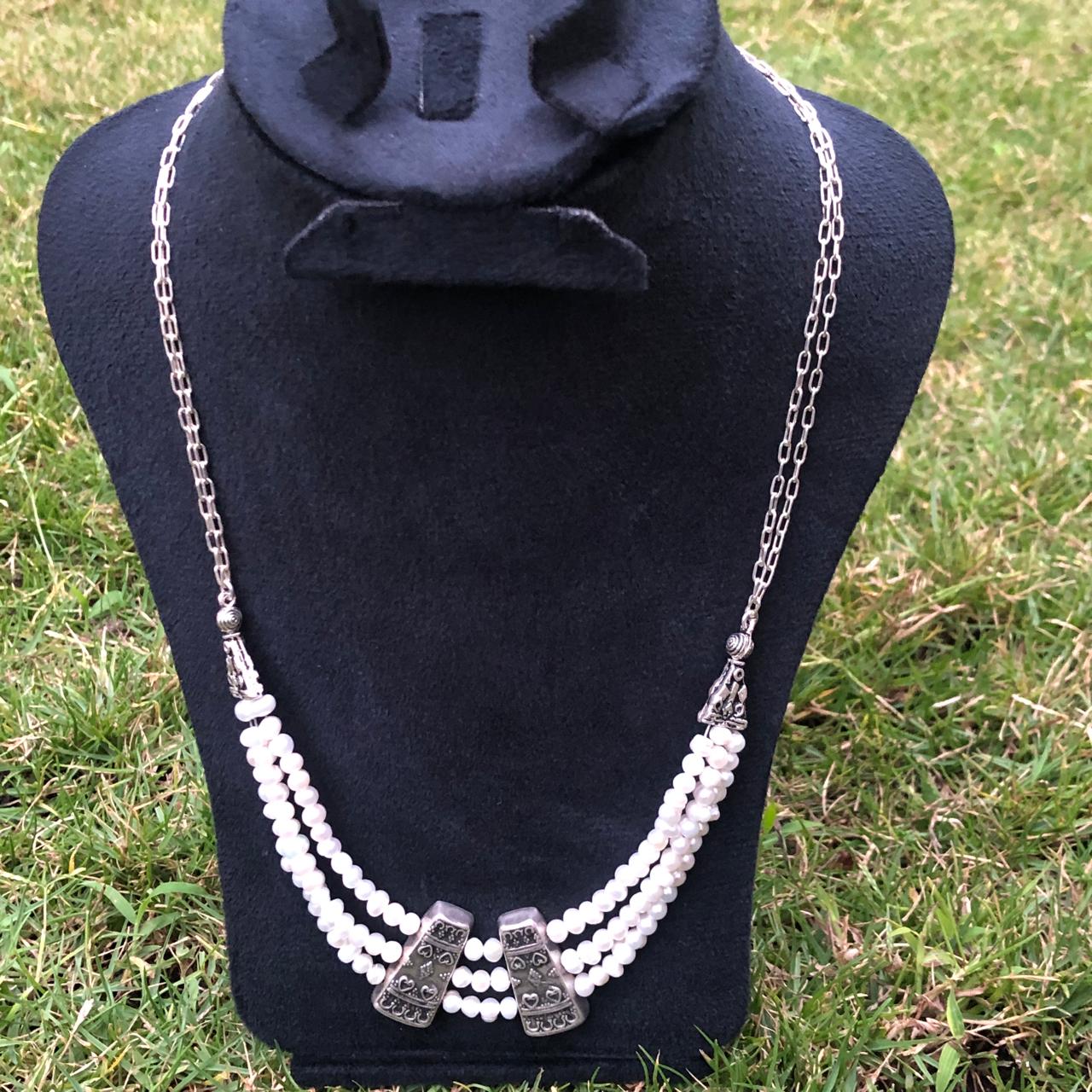 العقد ده معمول يدوي من فضة 925 أصلية، ومكوّن من لؤلؤ طبيعي مع فضة بتدي شكل مميز وكلاسيكي.