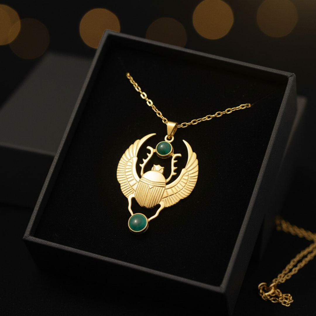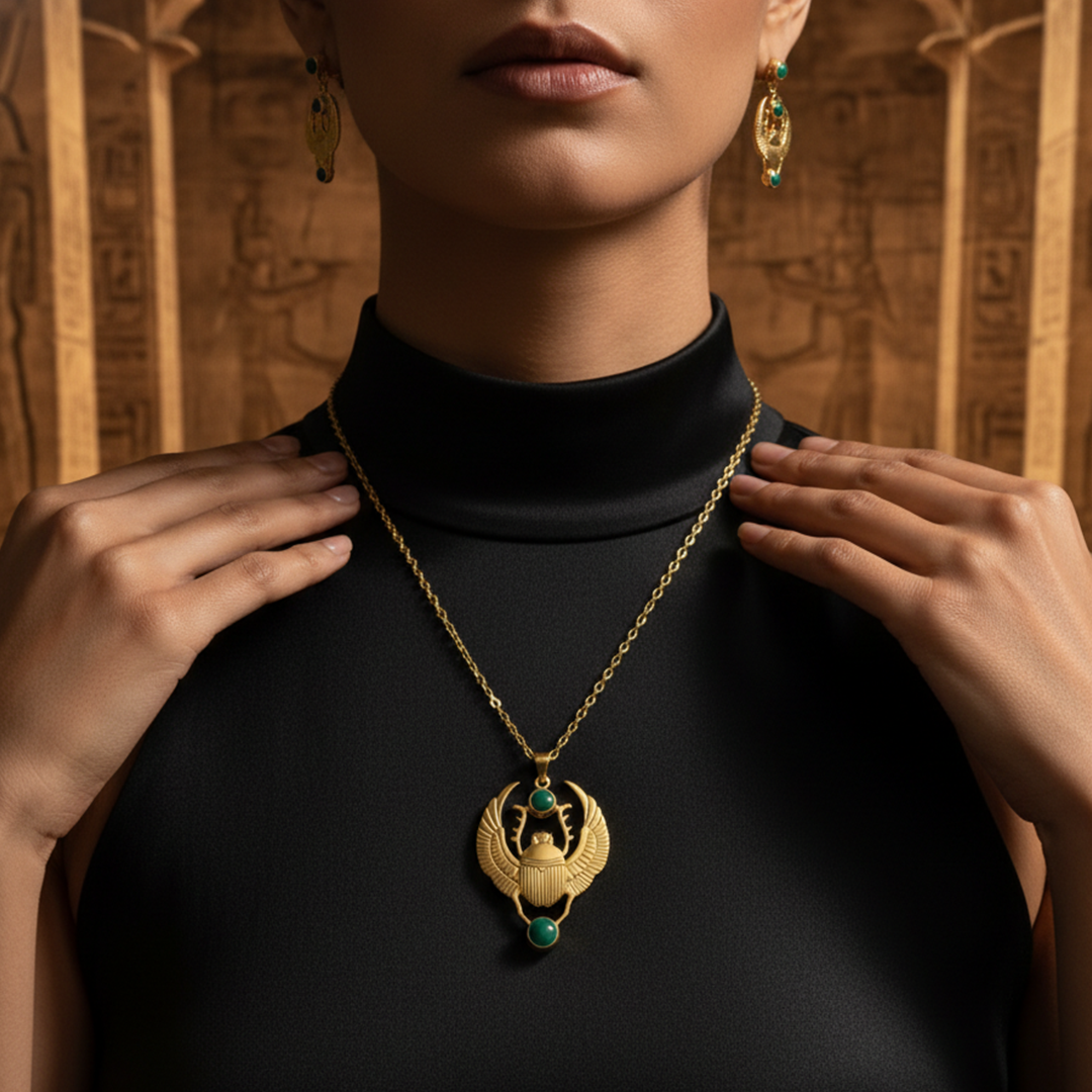 - Experience timeless elegance with the Malachite Khepri necklace— a unique blend of heritage, luxury, and confidence crafted for the modern woman.