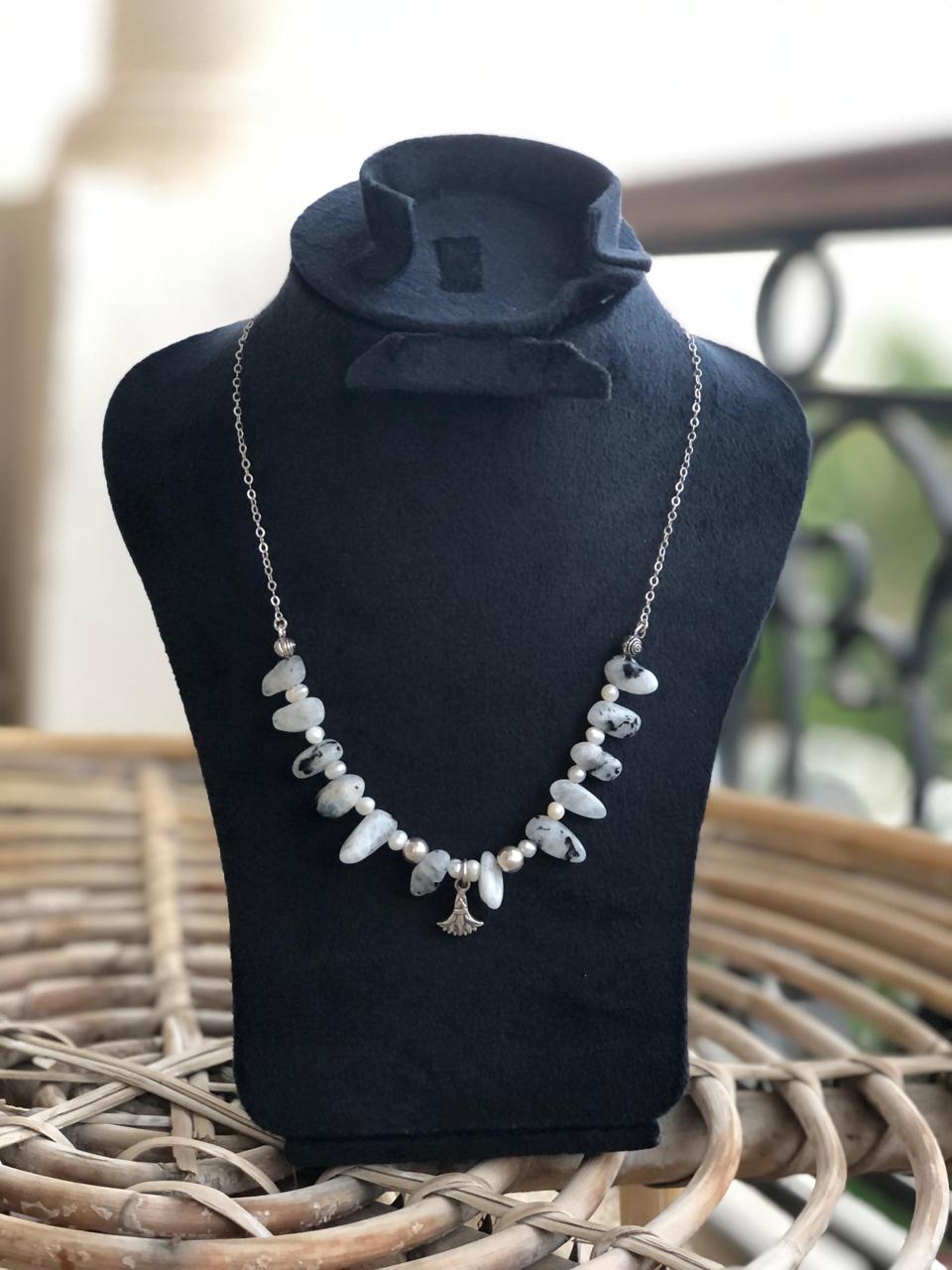 عقد فضة 925 معمول يدوي، متكوّن من أحجار مونستون زرقا طبيعية، تصميم هادي وبسيط وينفع في كل وقت.
