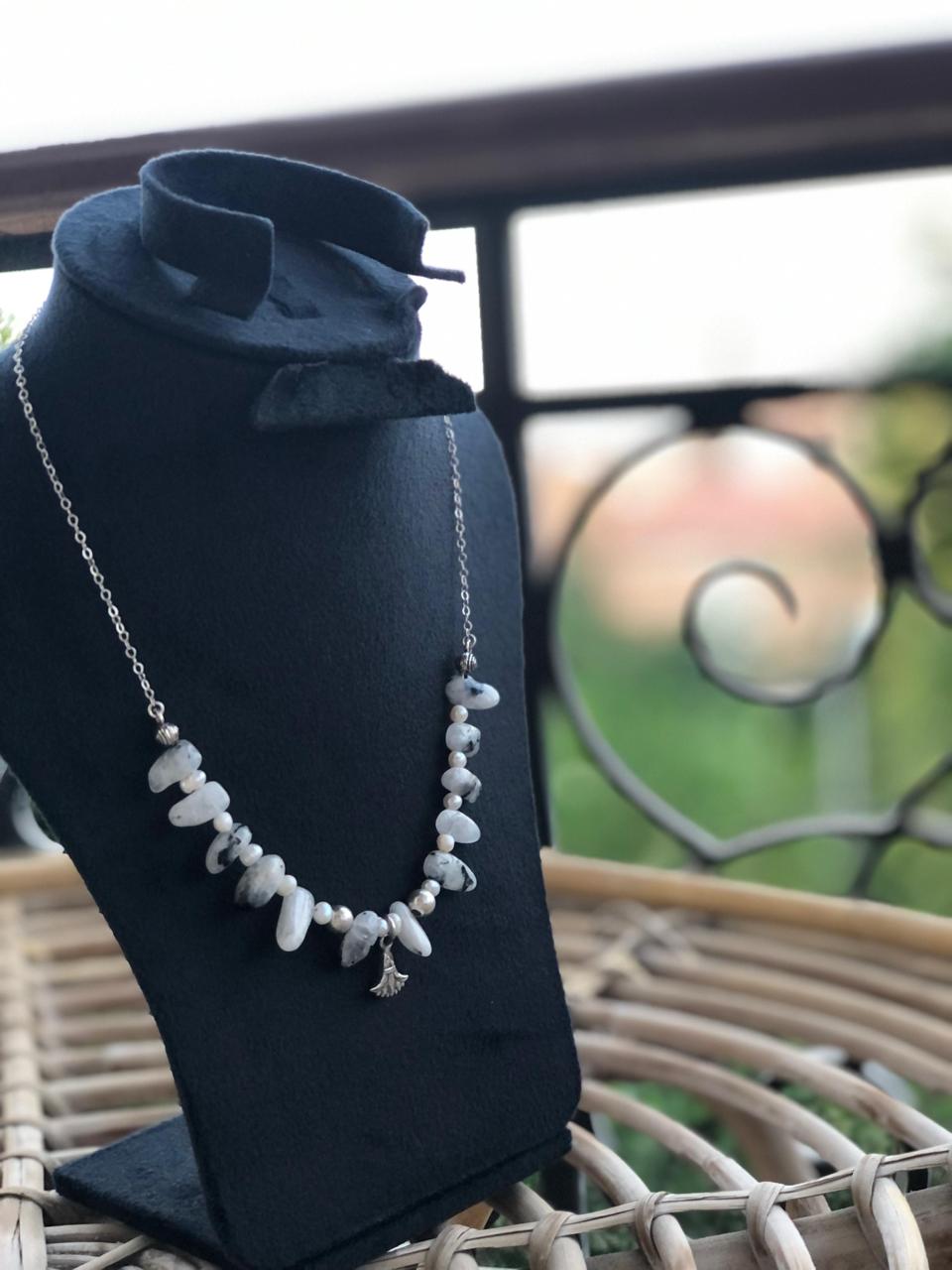 العقد ده معمول يدوي من فضة 925 أصلية، ومتكوّن من أحجار مونستون زرقا طبيعية بلمعة هادية وشكل بسيط. كل حجر متختار بعناية علشان يطلع التصميم متناسق ومريح.