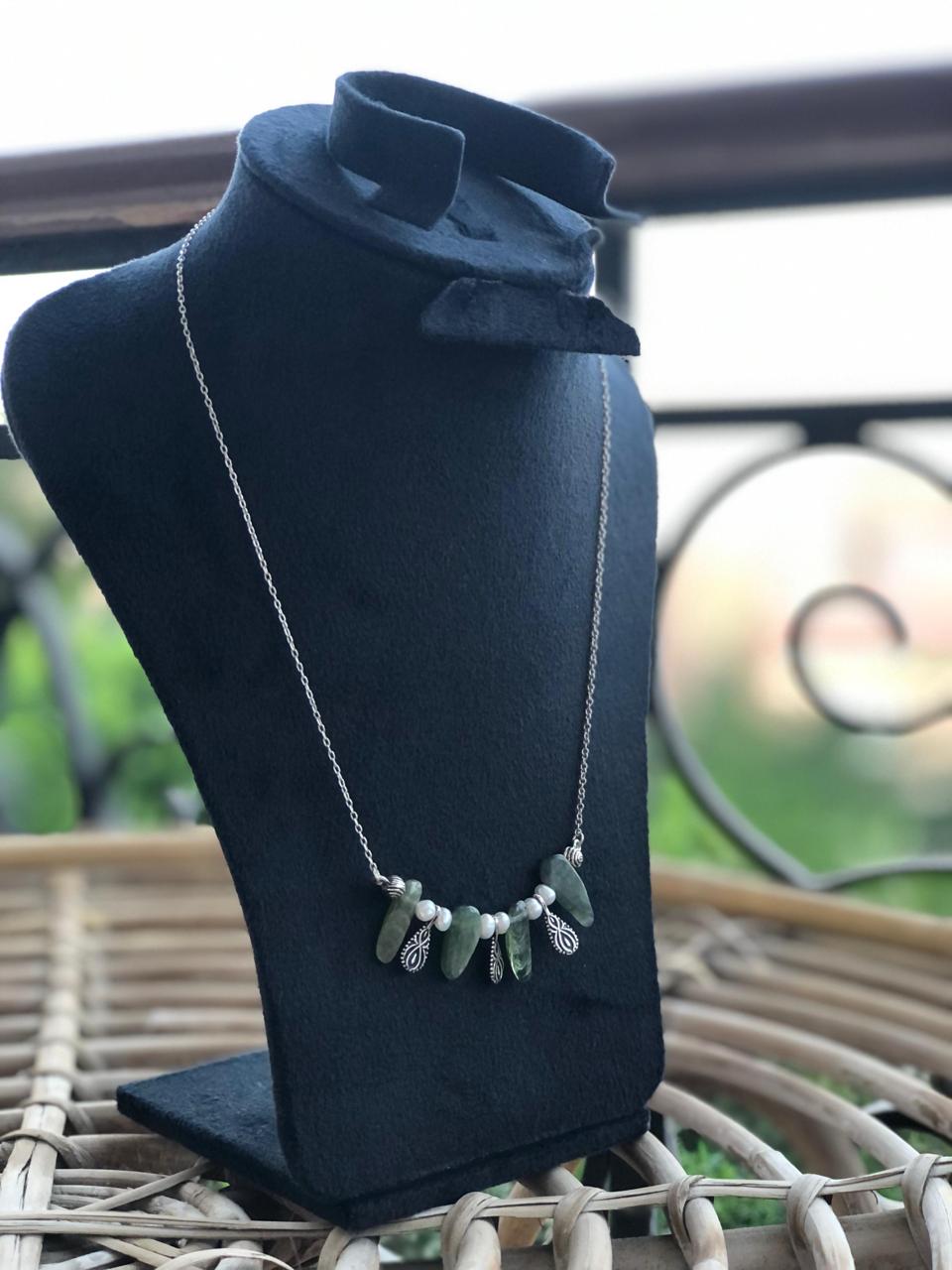عقد فضة 925 معمول يدوي، متكوّن من أحجار أباتيت خضرا طبيعية، تصميم بسيط وعملي.