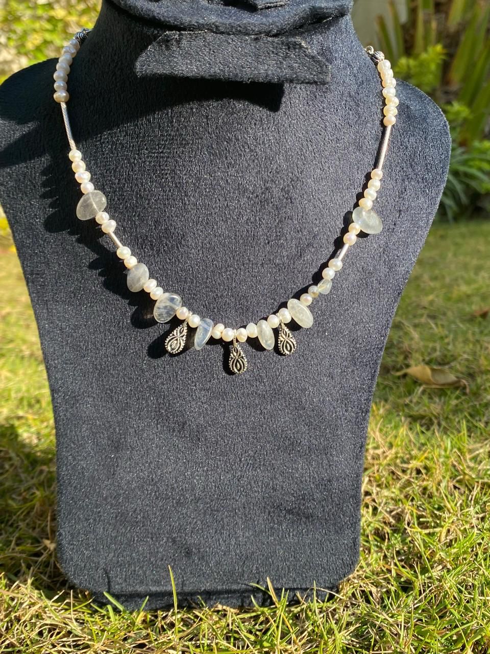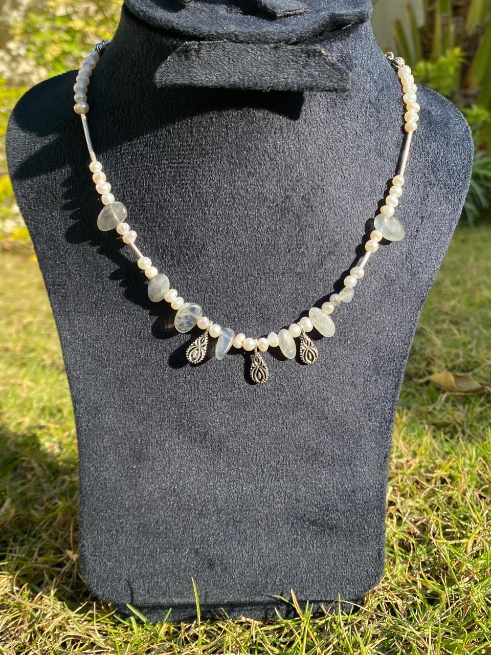 Handmade 925 Silver necklace made with natural pearls and labradorite stones. Simple design with a soft shine, suitable for daily wear or casual outings.