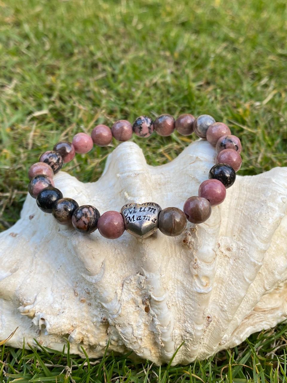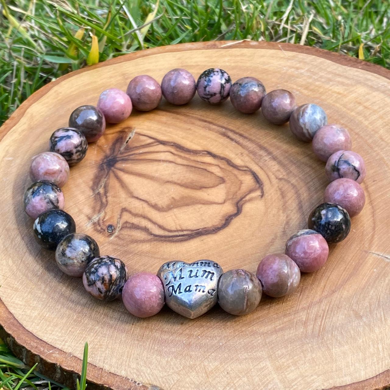 This handmade 925 silver bracelet features natural rhodonite stones in soft pink and dark tones, giving it a balanced and natural look. It comes with a silver heart-shaped pendant engraved with “Mother, Mommy, Mum, Mom, Mama.”