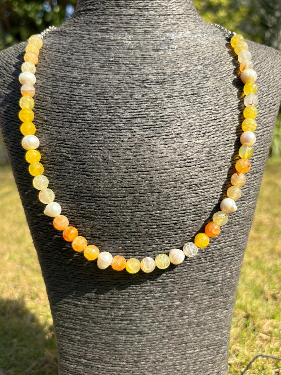 This handmade 925 Silver necklace features natural Yellow Agate stones paired with soft pearl stones in a clean and balanced arrangement. The warm yellow tones add brightness, while the pearls keep the look simple and easy to style.