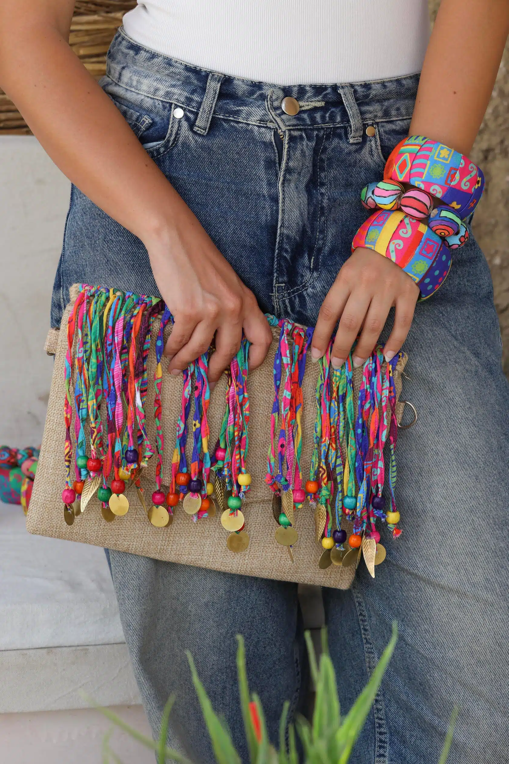 Meet the Happy Hippie beach bag that will level up all your summer outfits. It features one of a kind tassels that are made from our own colorful printed fabrics to be your playful caryall for beach days, morning picnics, or any outing under the sun. It’ll be your favorite accessory that will add vibrant energy to any outfit. It has a zipper and removable straps, so that you can use it as a cross bag or a clutch.