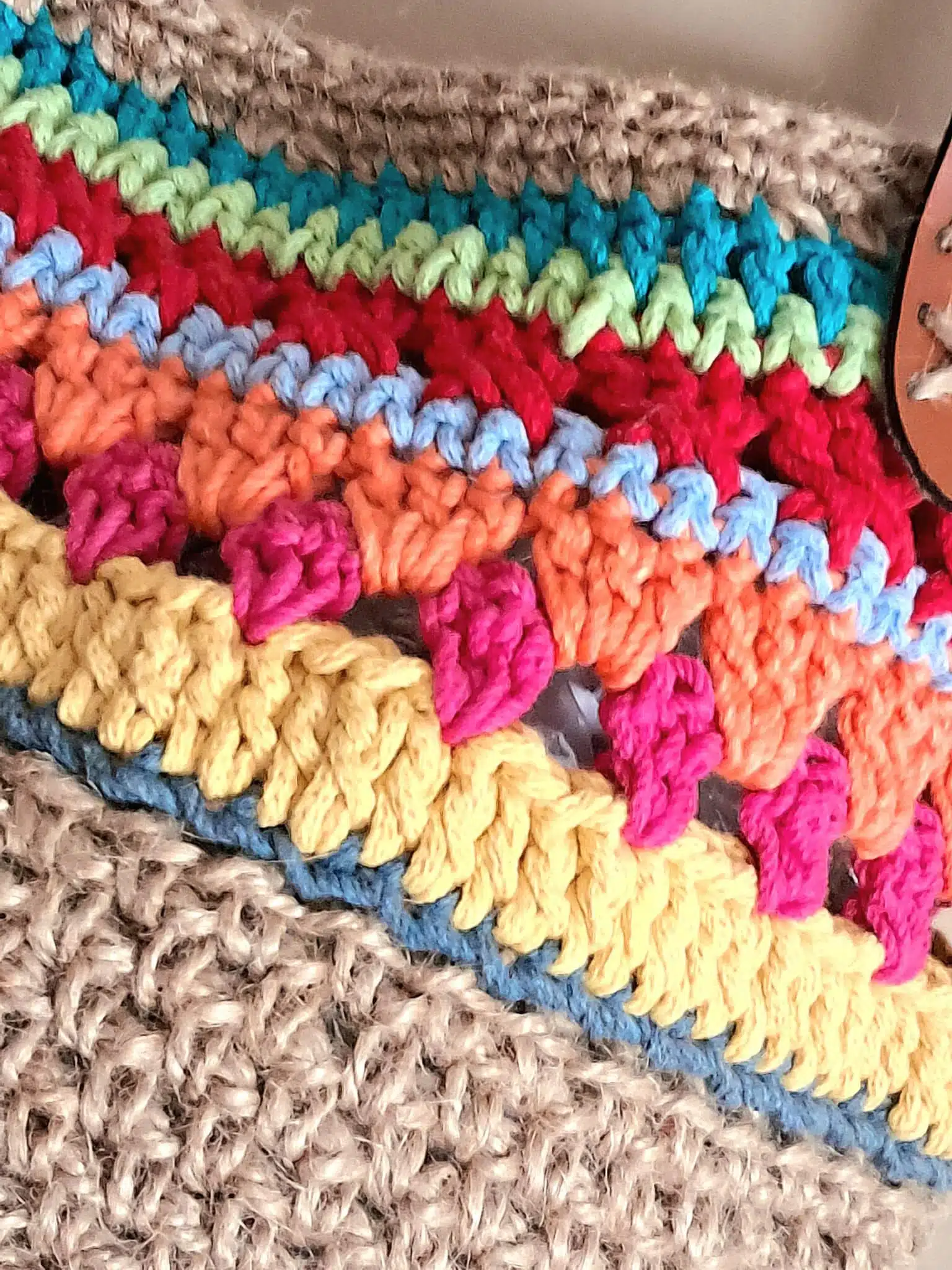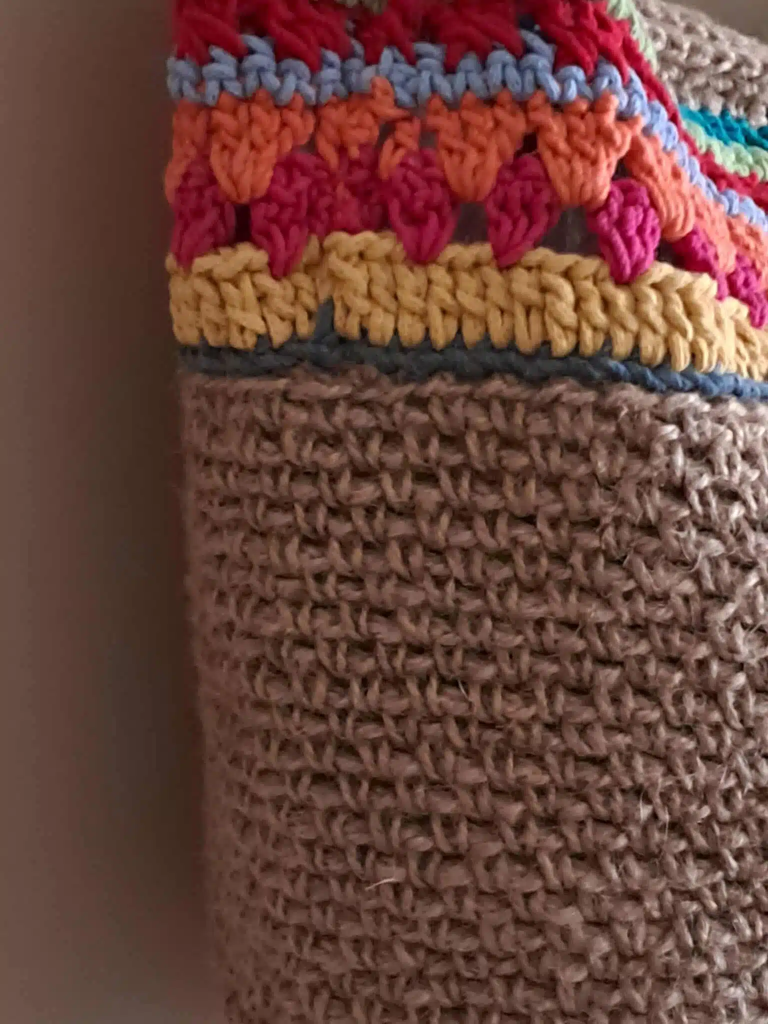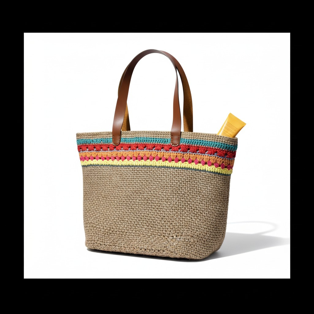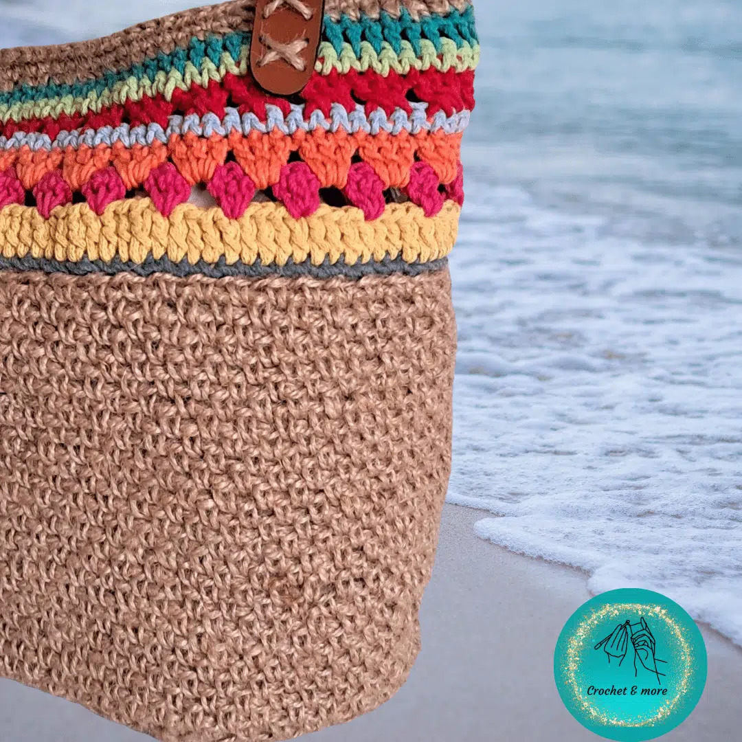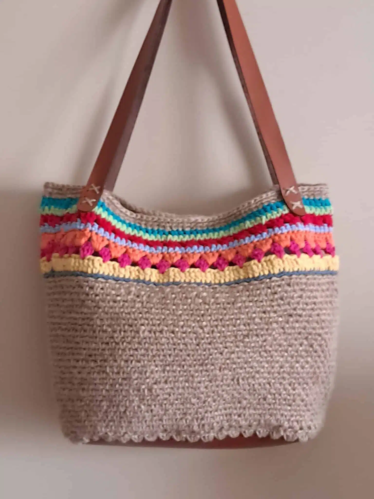 Big summer Tote colorful handmade bag, made of natural beige jute and multi color cotton top border.