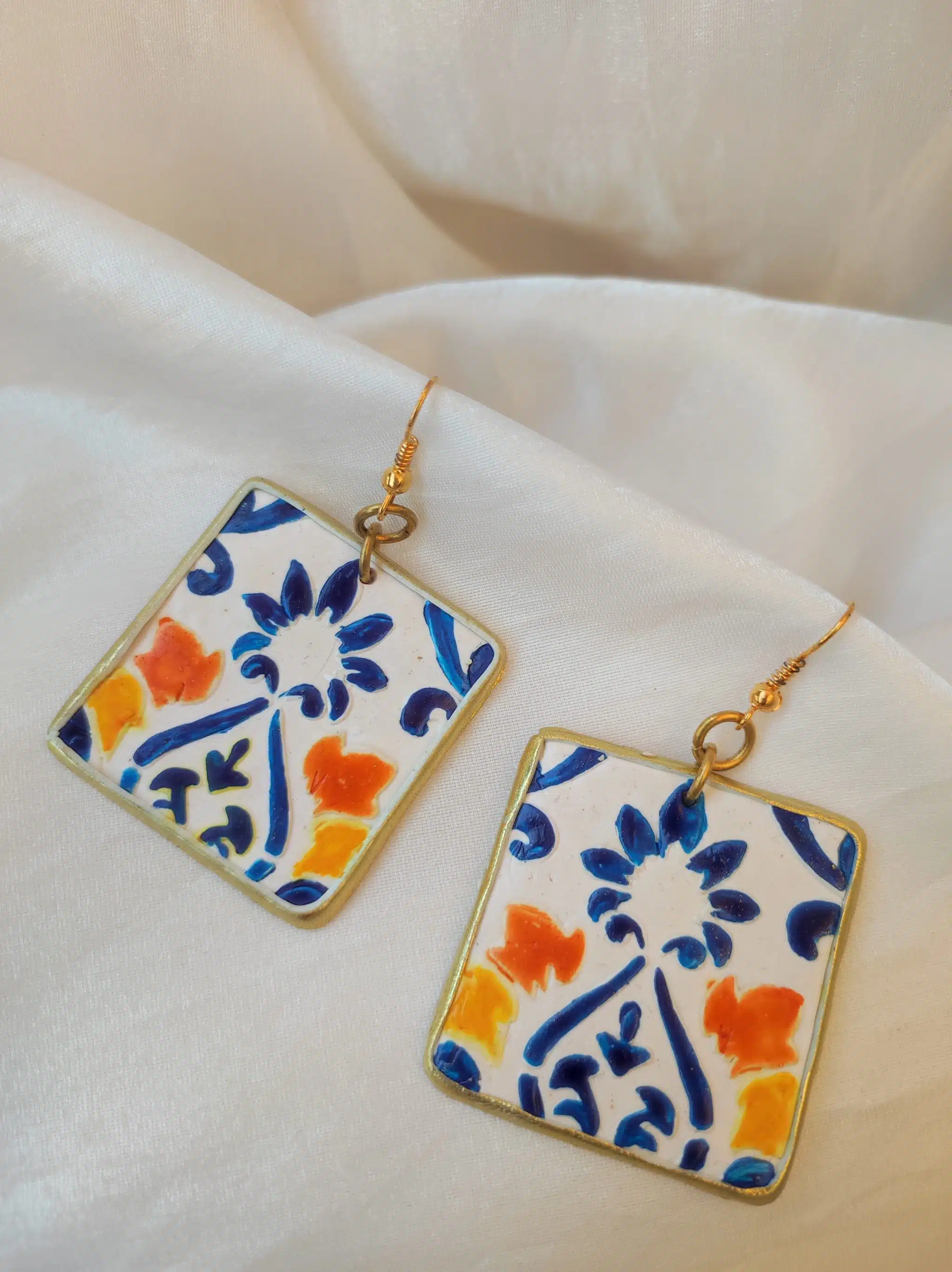 Square earring made of polymer clay decorated with soft, colorful plant motifs.