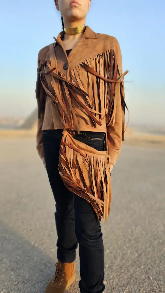 حقيبة HAZEL الصديقة للبيئة مصنوعة من بقايا الأقمشة، وتتميز بالشراشيب المصنوعة من الشمواه و الجلد باللونين الأسود والهافان، لتكون أكسسوارات أنيقة ومستدامة.