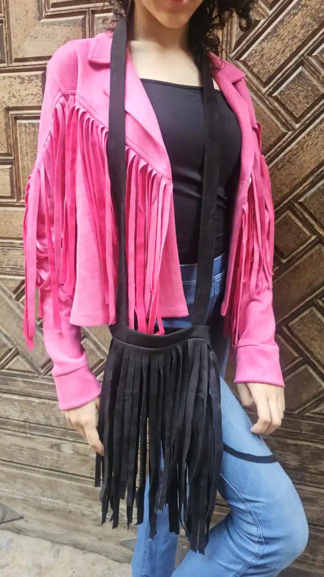 HAZEL Eco-Friendly Bag, made from fabric remains, features trendy suede and leather tassels in black and havan for a stylish and sustainable accessory.