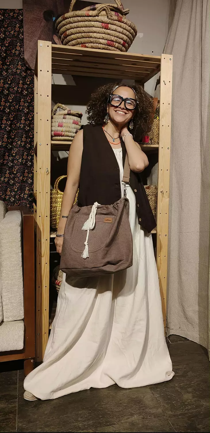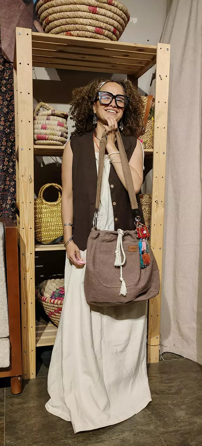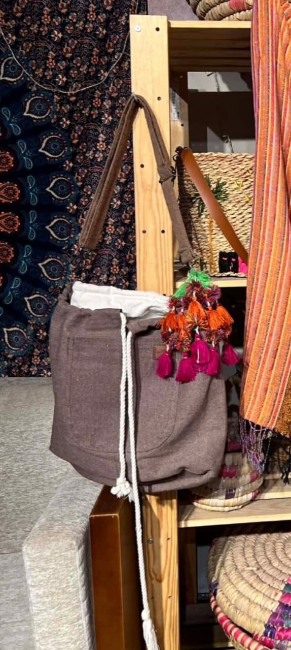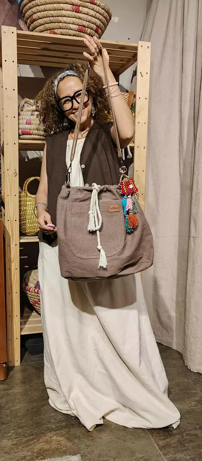 شنطة من الكتان الثقيل لون بني مع ميدالية بدوية