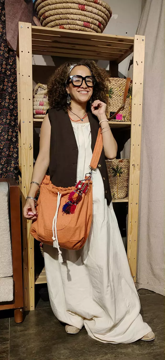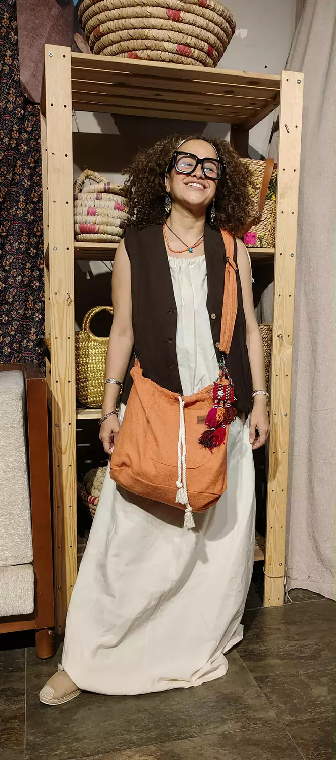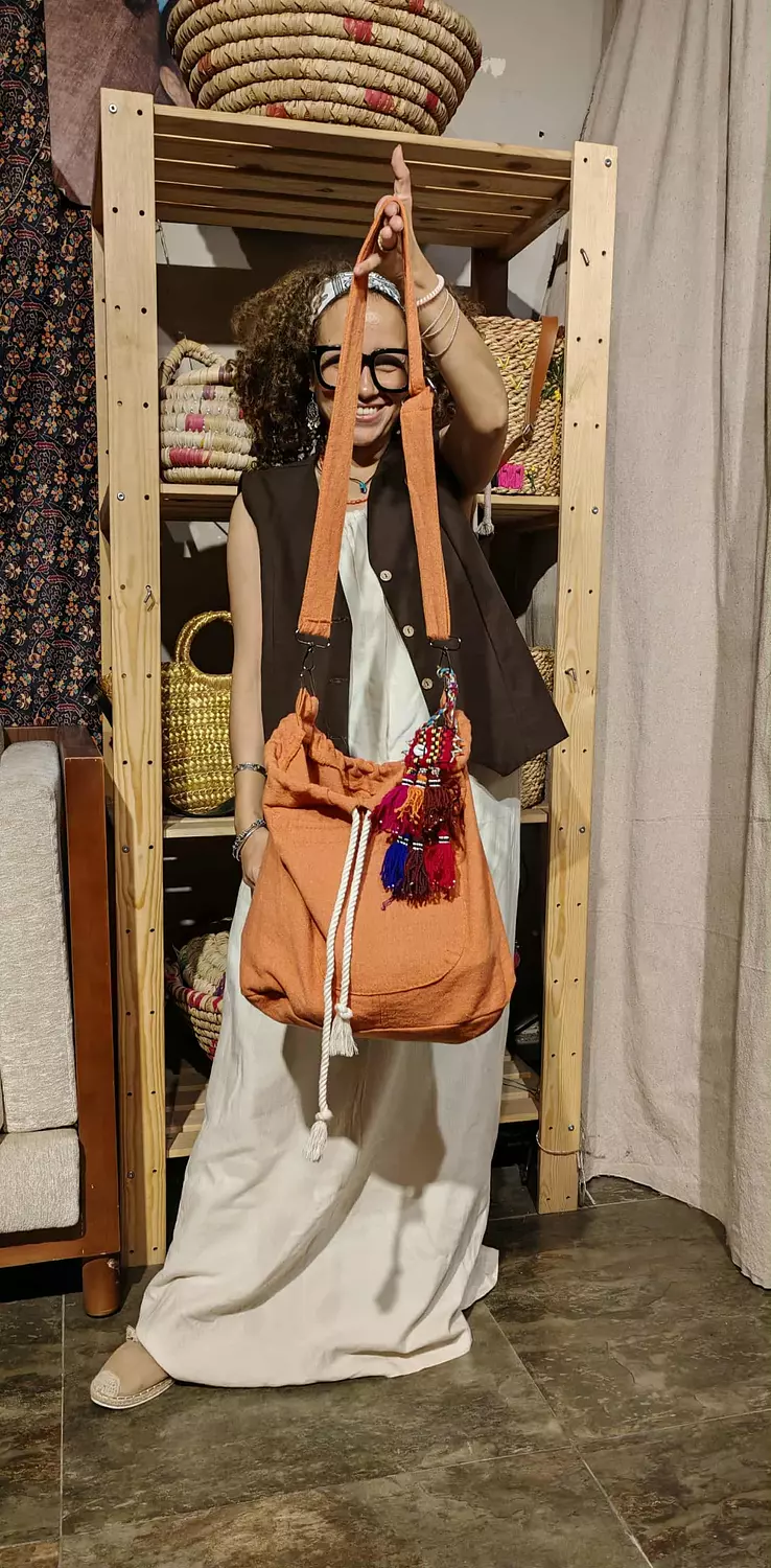 شنطة من الكتان الثقيل لون برتقالي مع ميدالية بدوية
