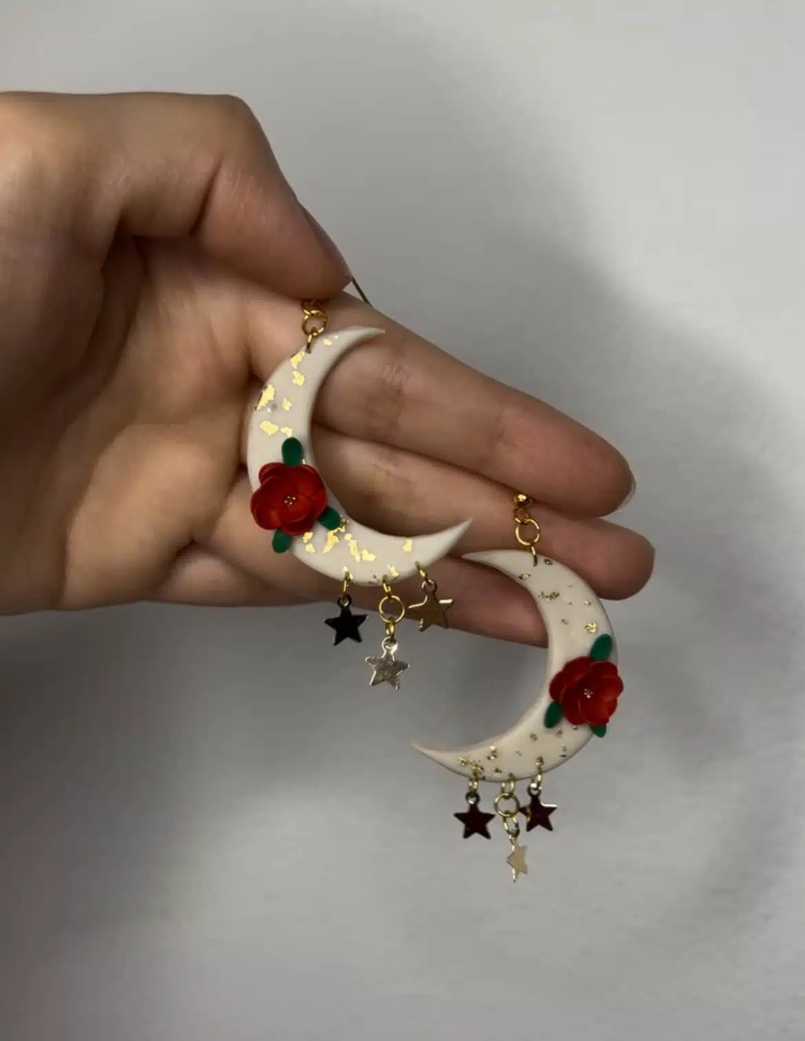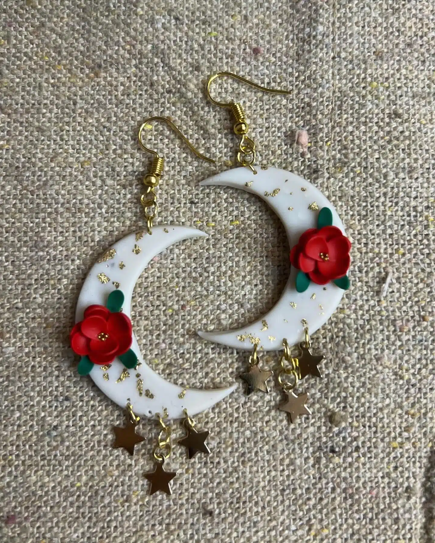 Handmade Polymer clay dangles, moon shaped, with golden leafs, and Red Rose.