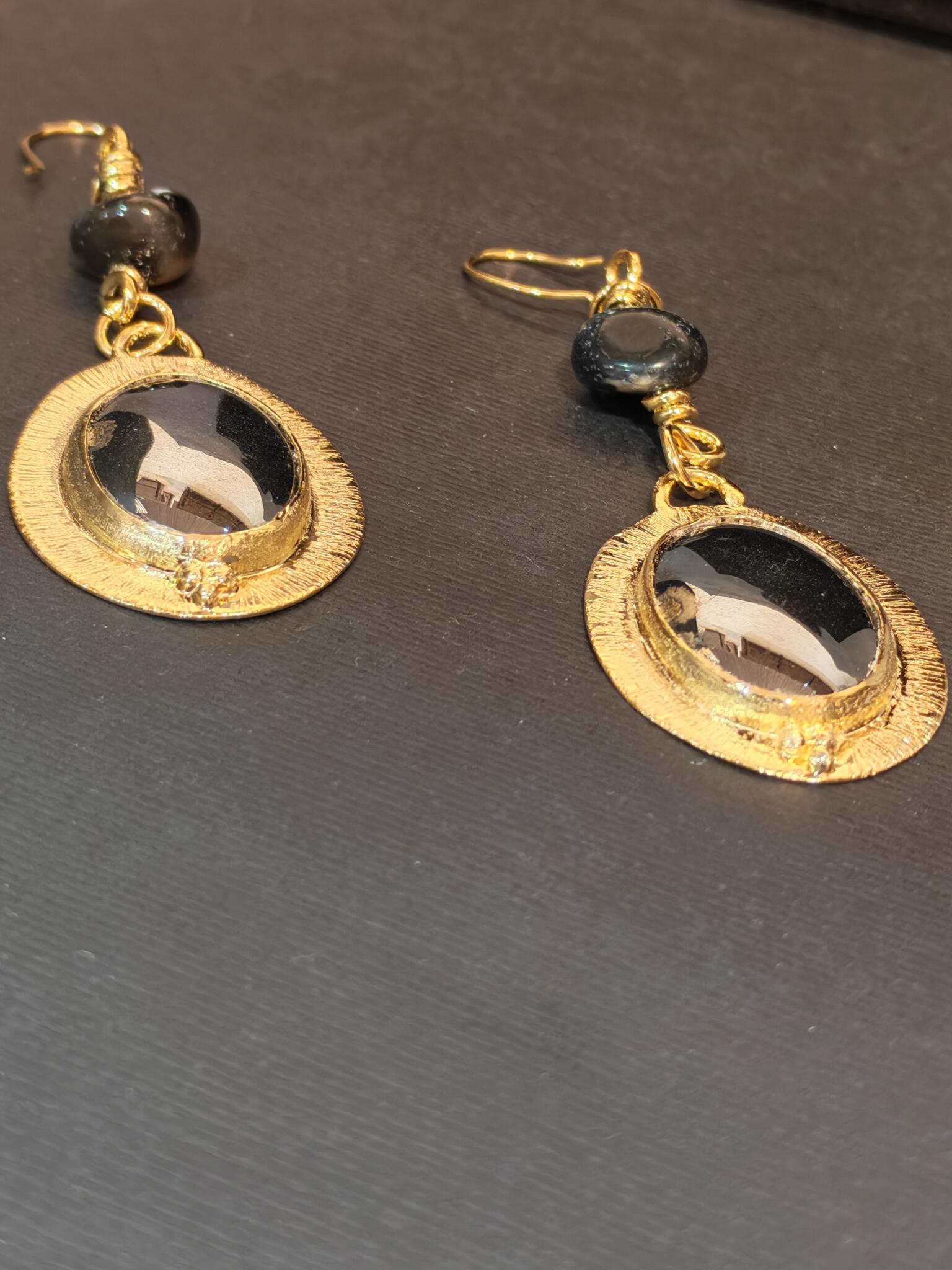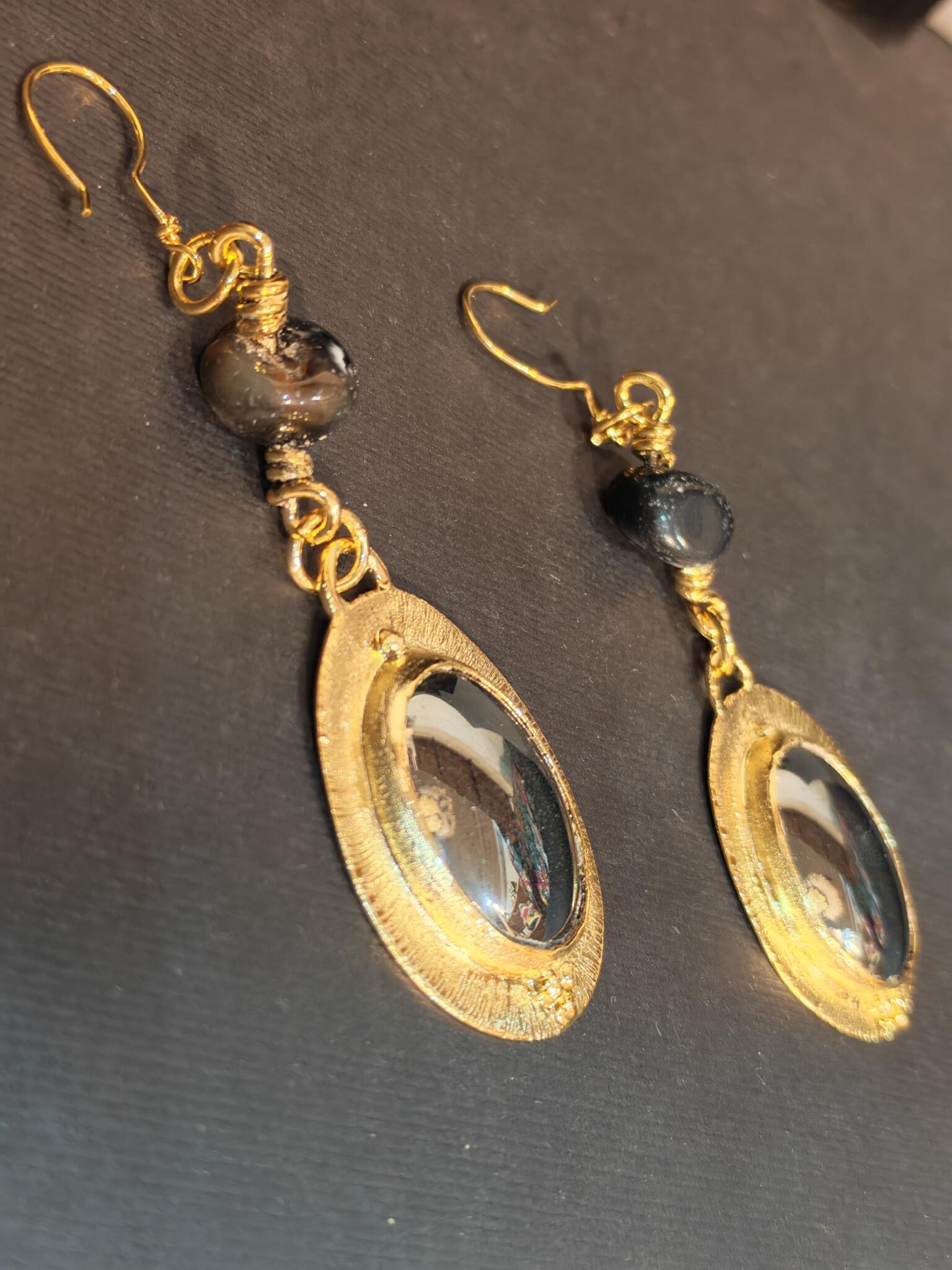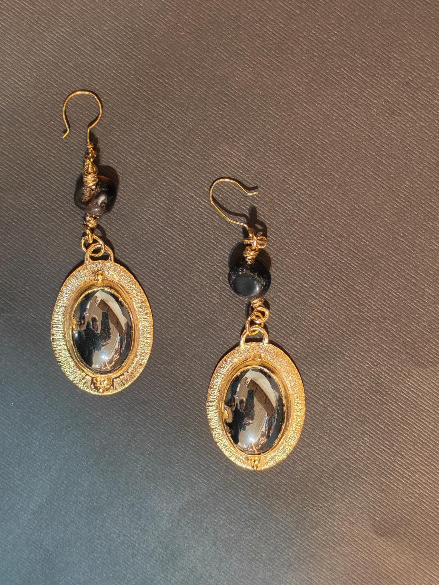 Gold plated textured brass earring with hematite and black agate stone.