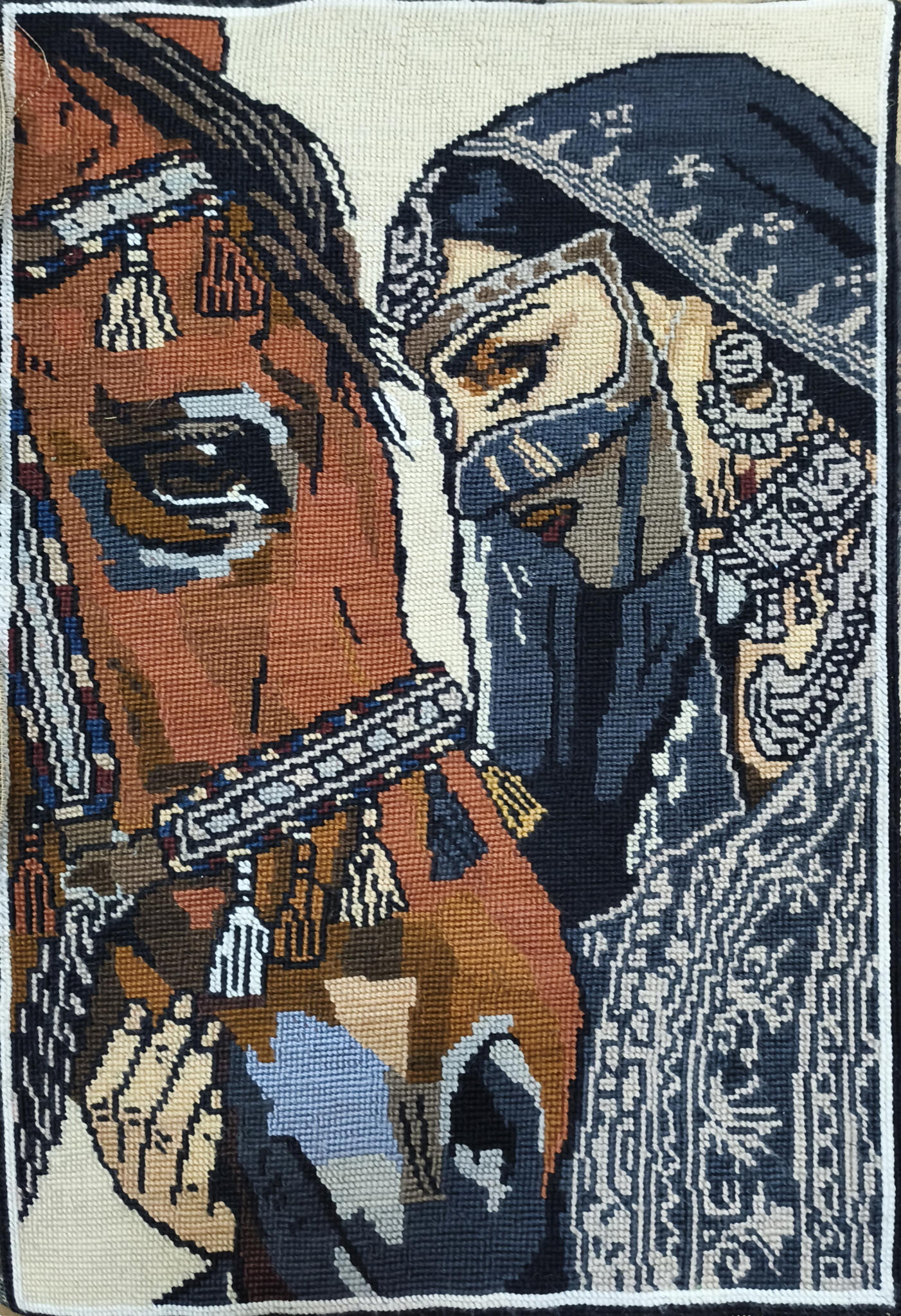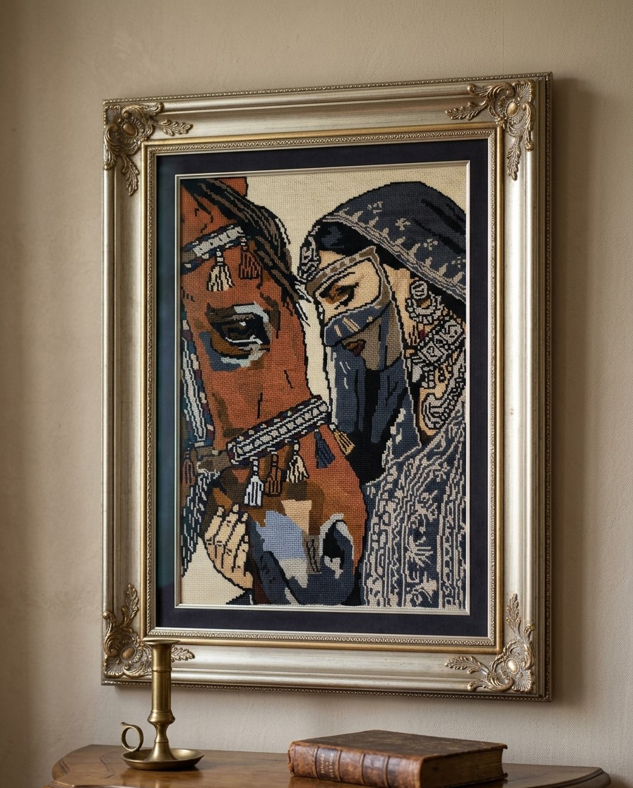 A heritage-inspired portrait capturing the soulful connection between a desert maiden and her stallion. Hand-stitched with premium virgin wool for a rich, textured finish.