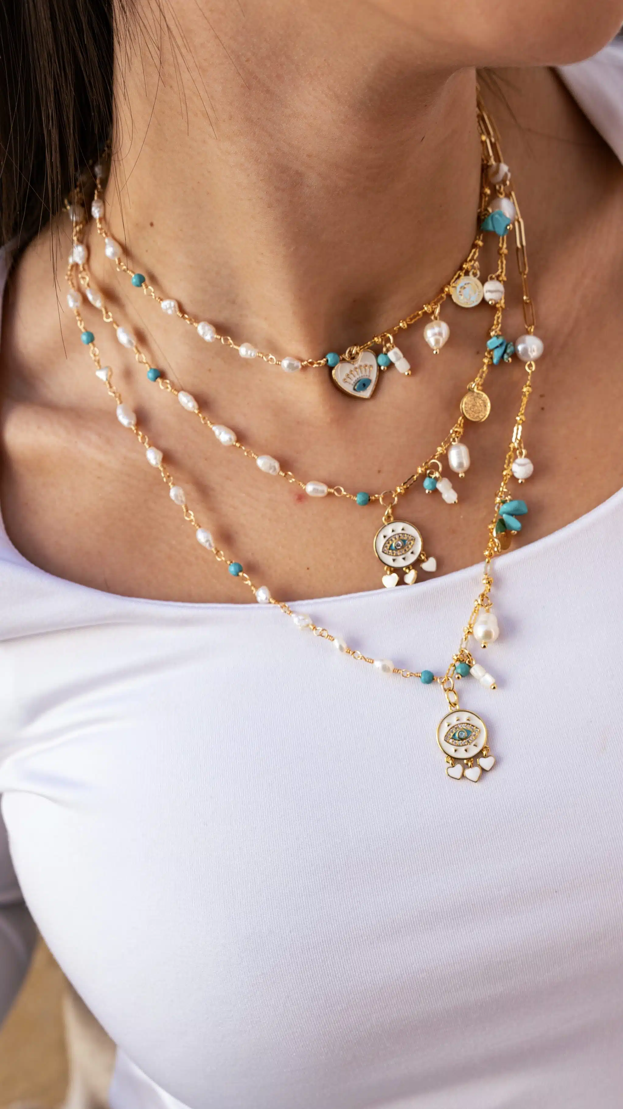 “هذا العقد الراقي يتميز بتصميمه البسيط والأنيق، حيث ينساب بخفة ليعكس ذوقًا رفيعًا في كل تفاصيله. تُضفي حبات اللؤلؤ البراقة لمسة من الفخامة والنعومة، مما يجعله الاختيار المثالي لإطلالة تُعبّر عن الأنوثة والجمال بلا تكلف. تصميمه يجمع بين الحداثة والكلاسيكية، ليُناسب جميع المناسبات ويمتزج بسهولة مع أزيائكِ الرمضانية المميزة.”