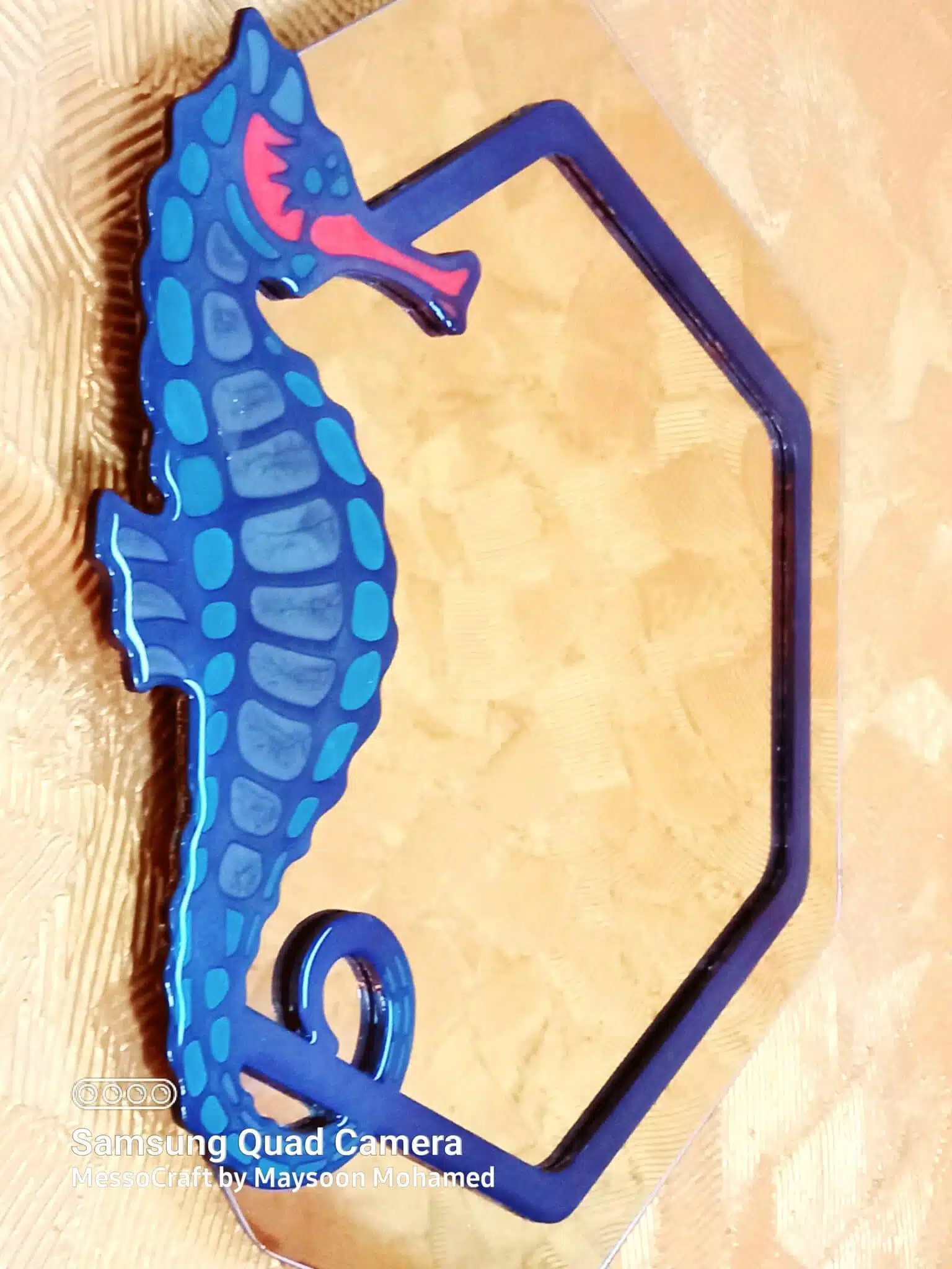 Hexagon mirror with a wooden frame and seahorse filled with pearly metallic resin colours
