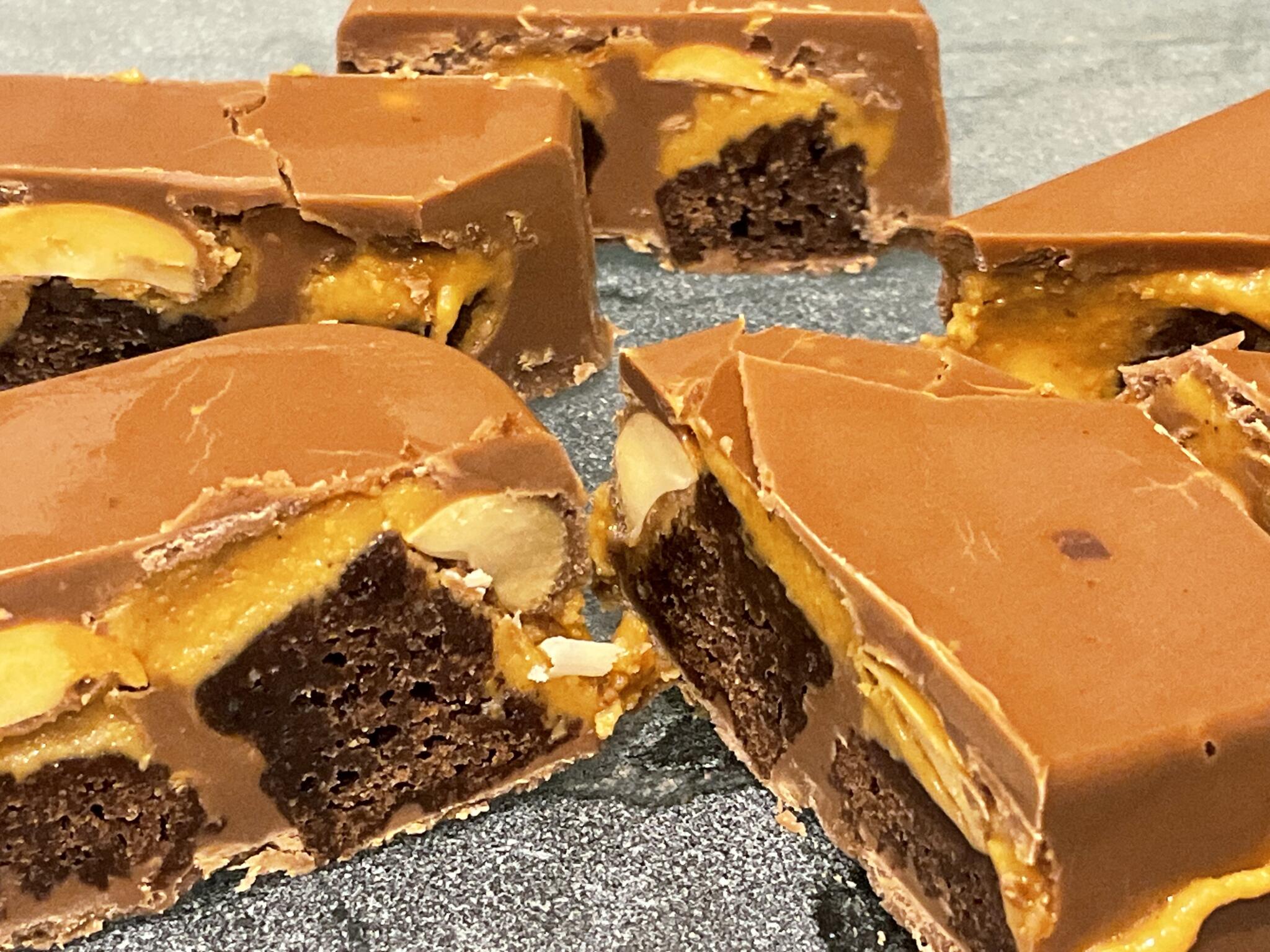 Sugar free milk chocolate, homemade peanut butter, peanuts, homemade honey caramel.